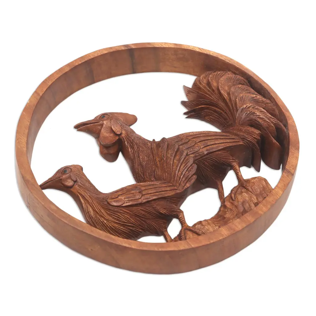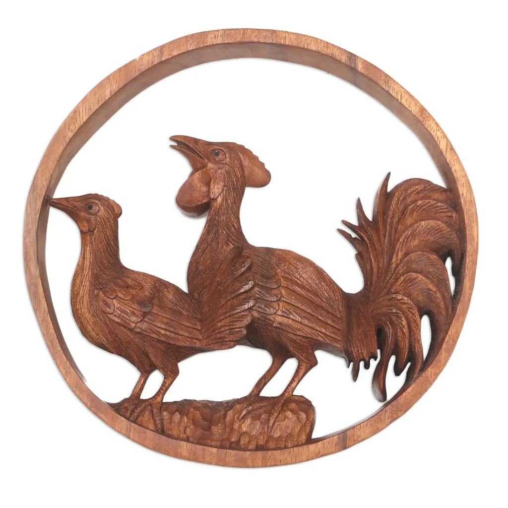 Brighten your blank walls with this charming relief panel from Bali's Made Wirata. Hand crafted from local suar wood, the circular panel features two chickens, a rooster and a hen, who crow from the center of a narrow wooden frame.