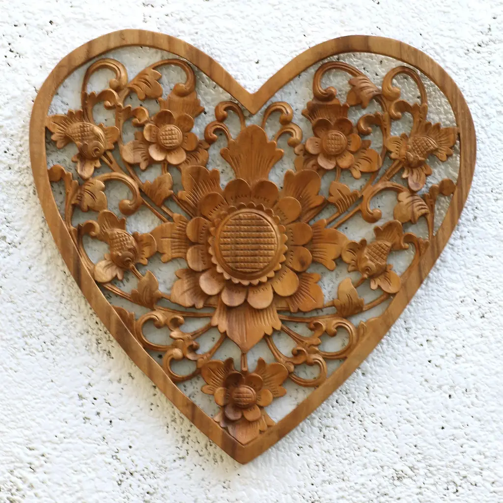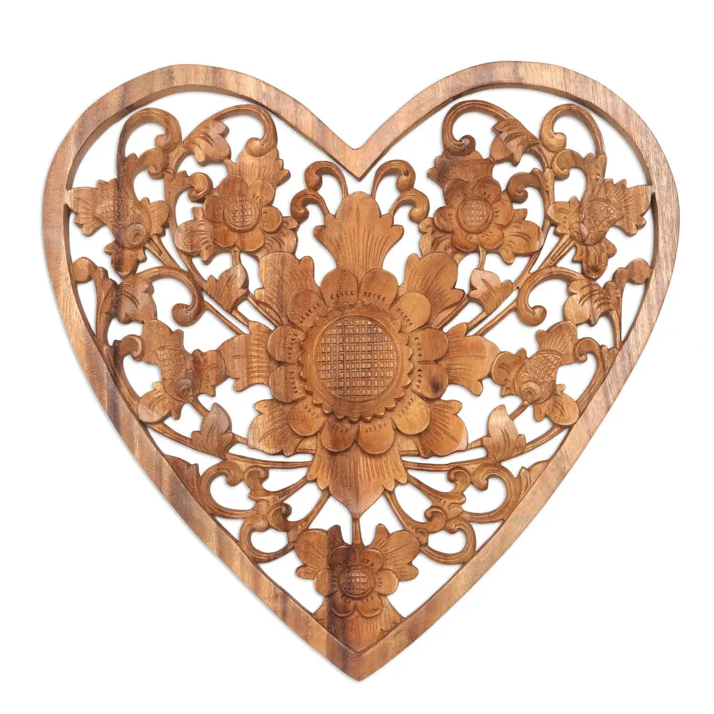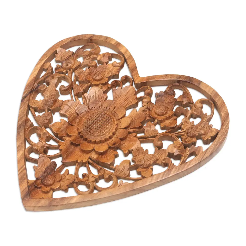 The interplay between the natural grain of the wood and the intricate carving of the artisans makes for a compelling work of art, worthy of prominent display. Komang Sri of Bali presents this work, hand carved from native suar wood, which features a pattern of flowers, buds, and vine tendrils within the frame of a heart.