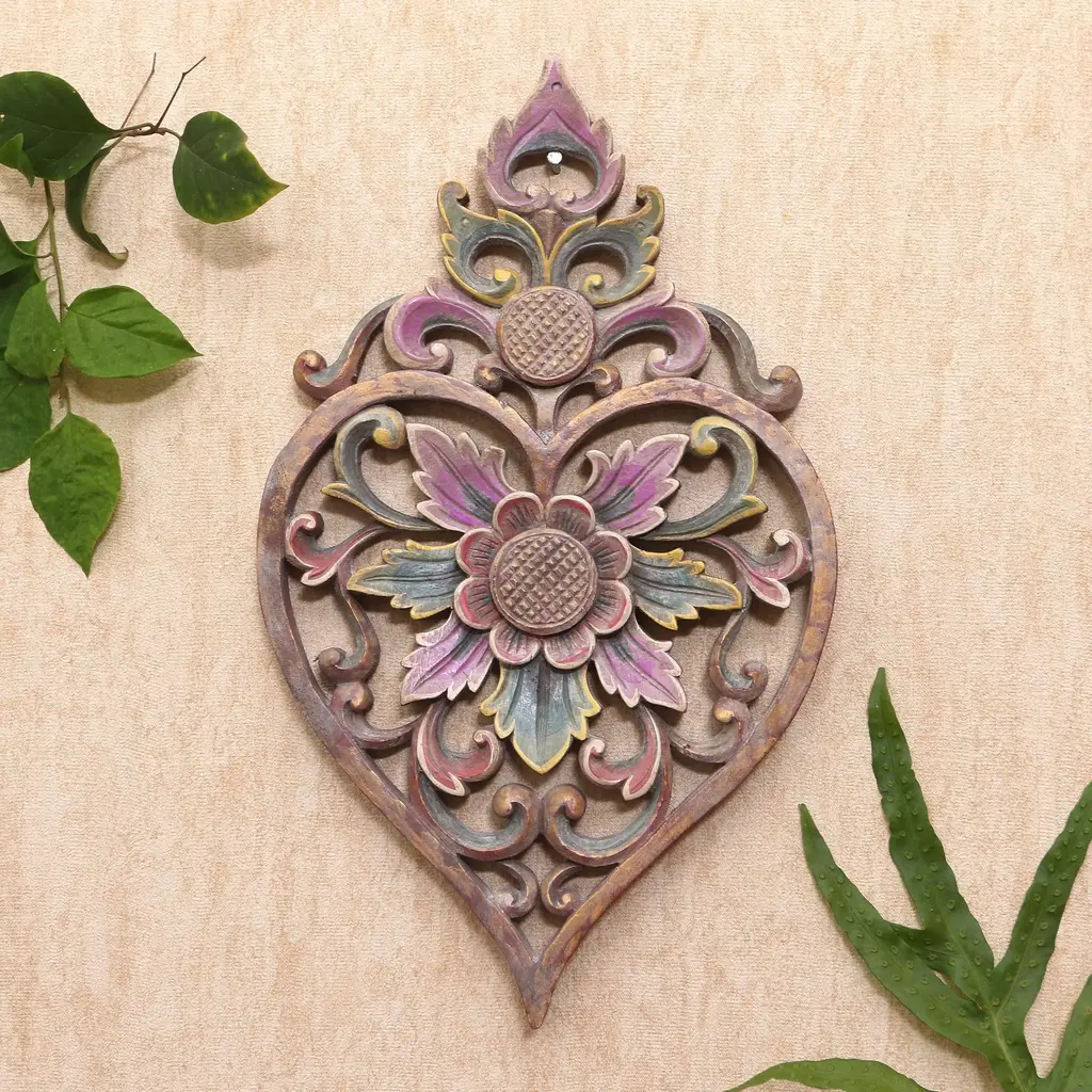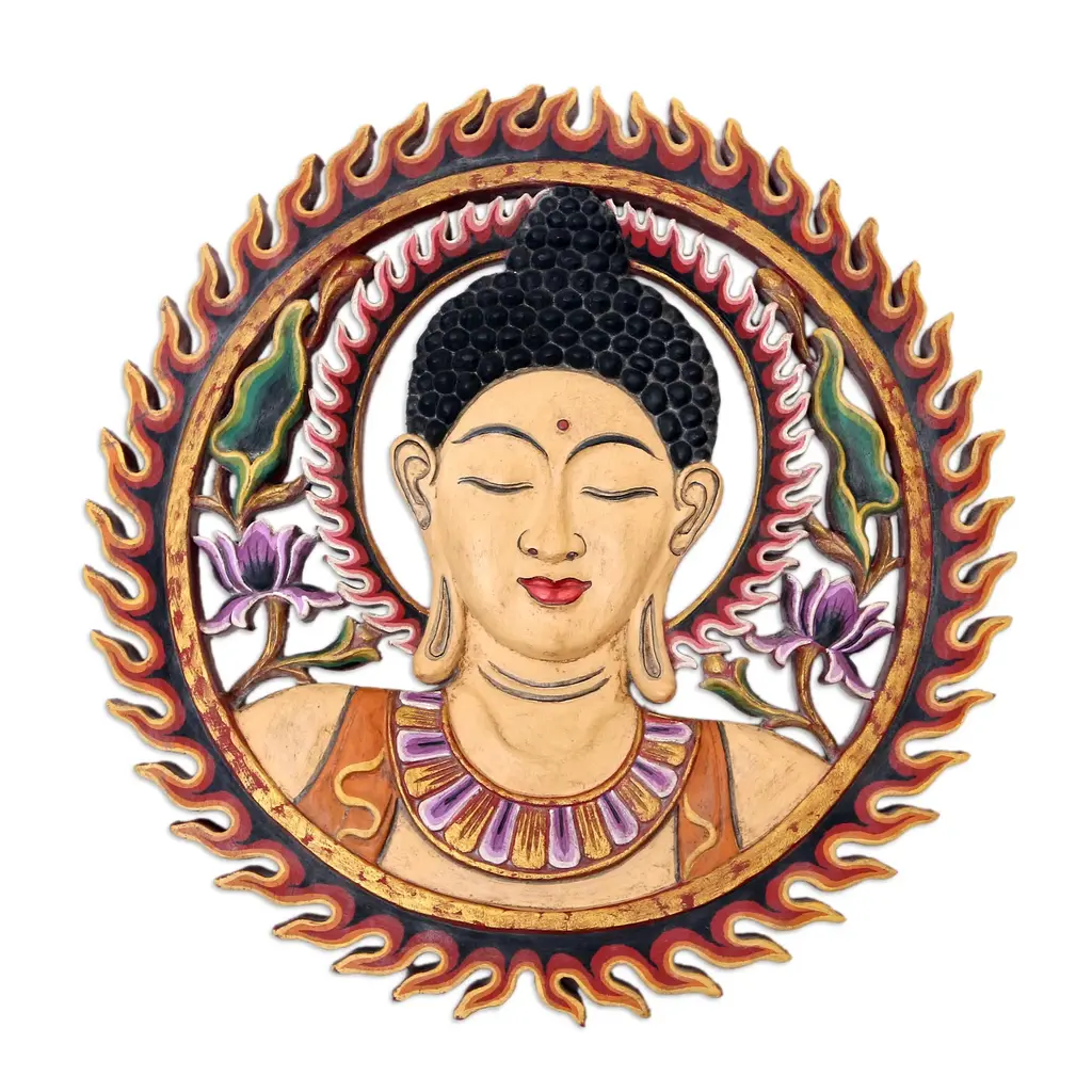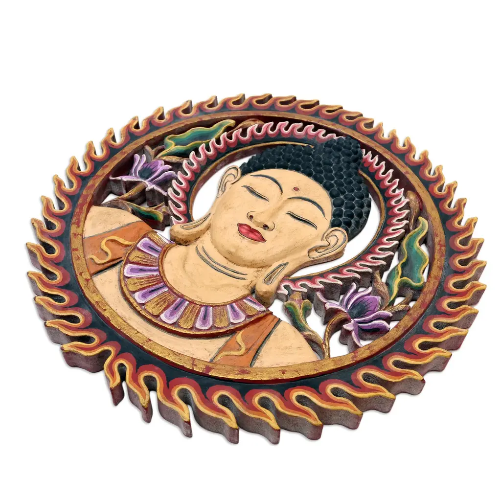 Ketut Sudantara centers his charming relief panel with an image of the Buddha, eyes closed in complete peace. The Balinese artisan hand carves the relief panel from local suar wood, carefully creating openwork designs between the Buddha and panel's frame. Finally, the panel is given a beautiful wash of color in red, gold, and green.
