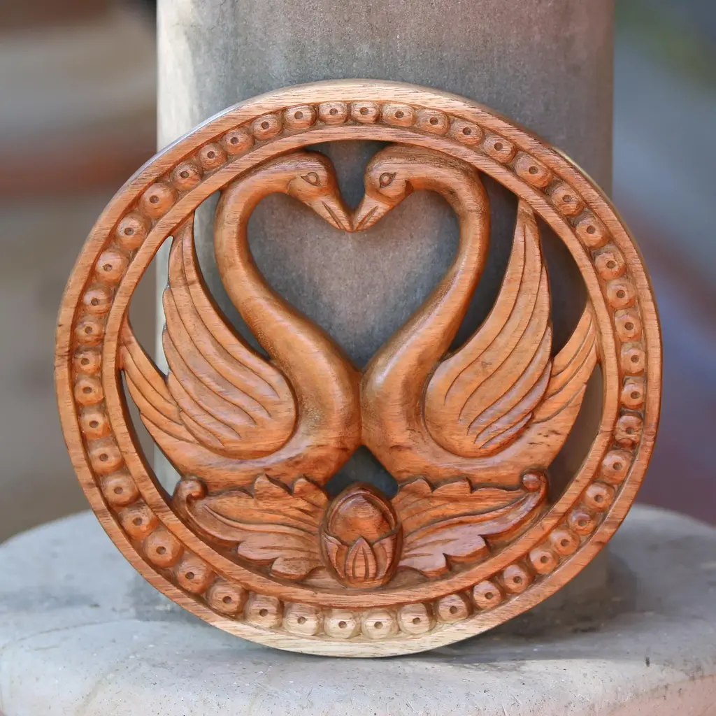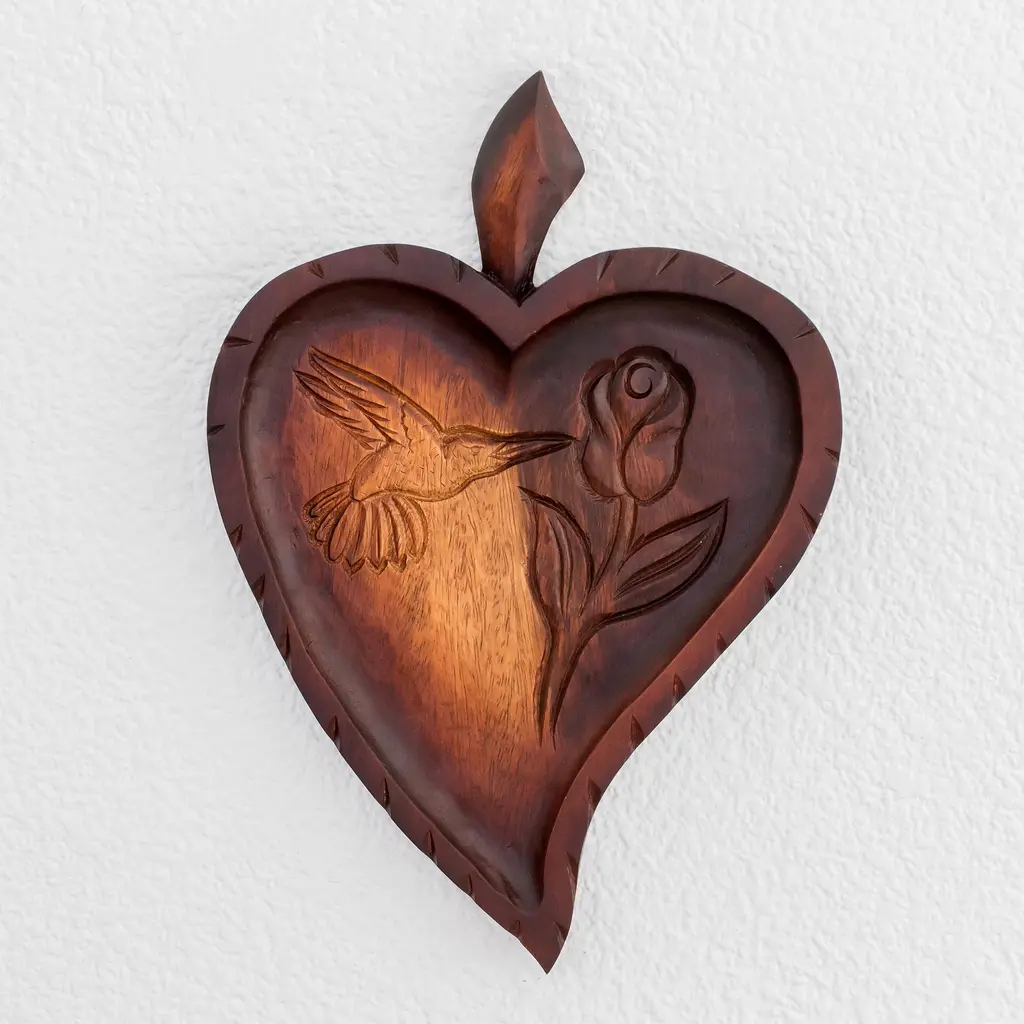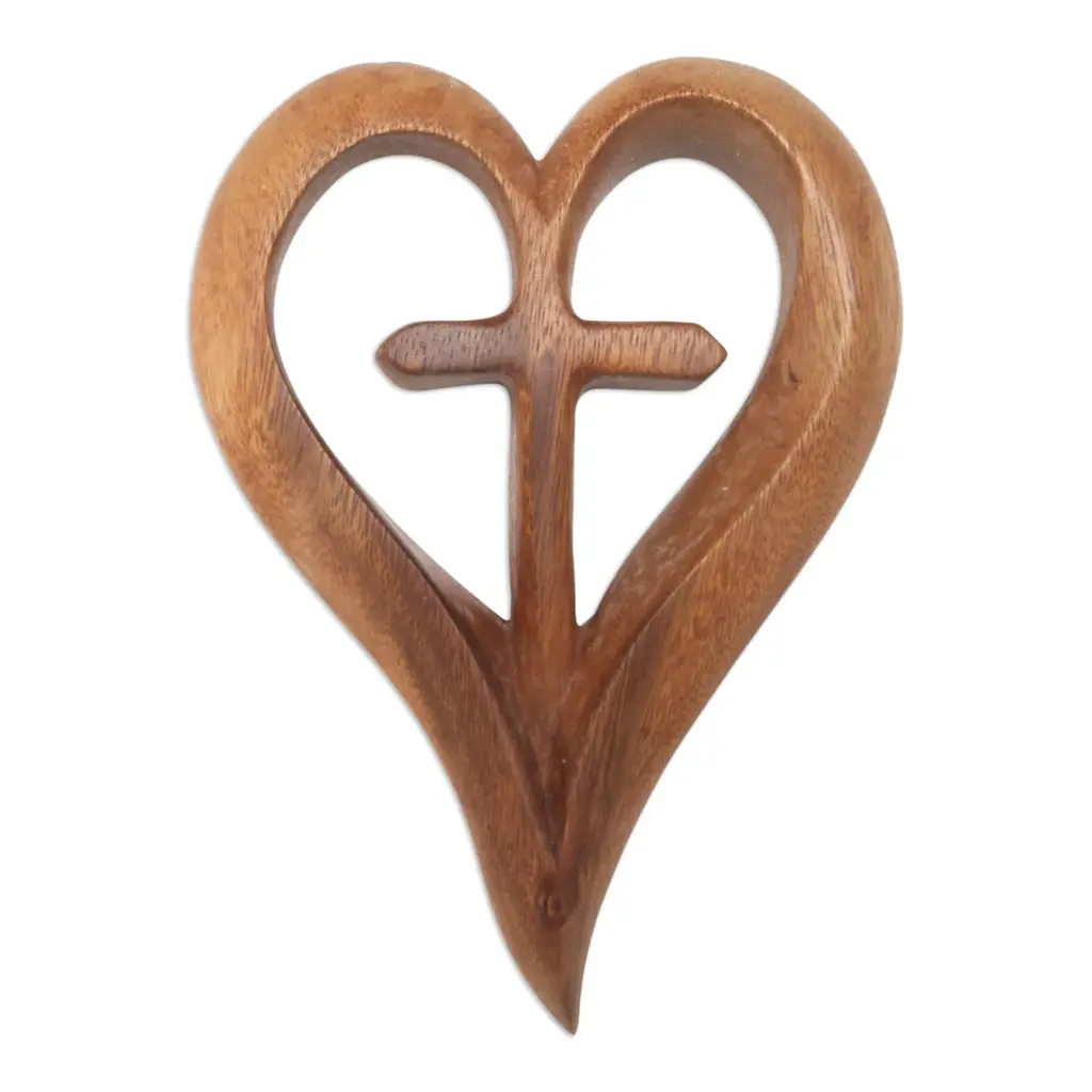 Bali's Eka presents this highly polished wood wall relief panel in the shape of a heart with a cross at its center. Carved from a single piece of native suar wood, the panel features elegant curves and and its original rich color.