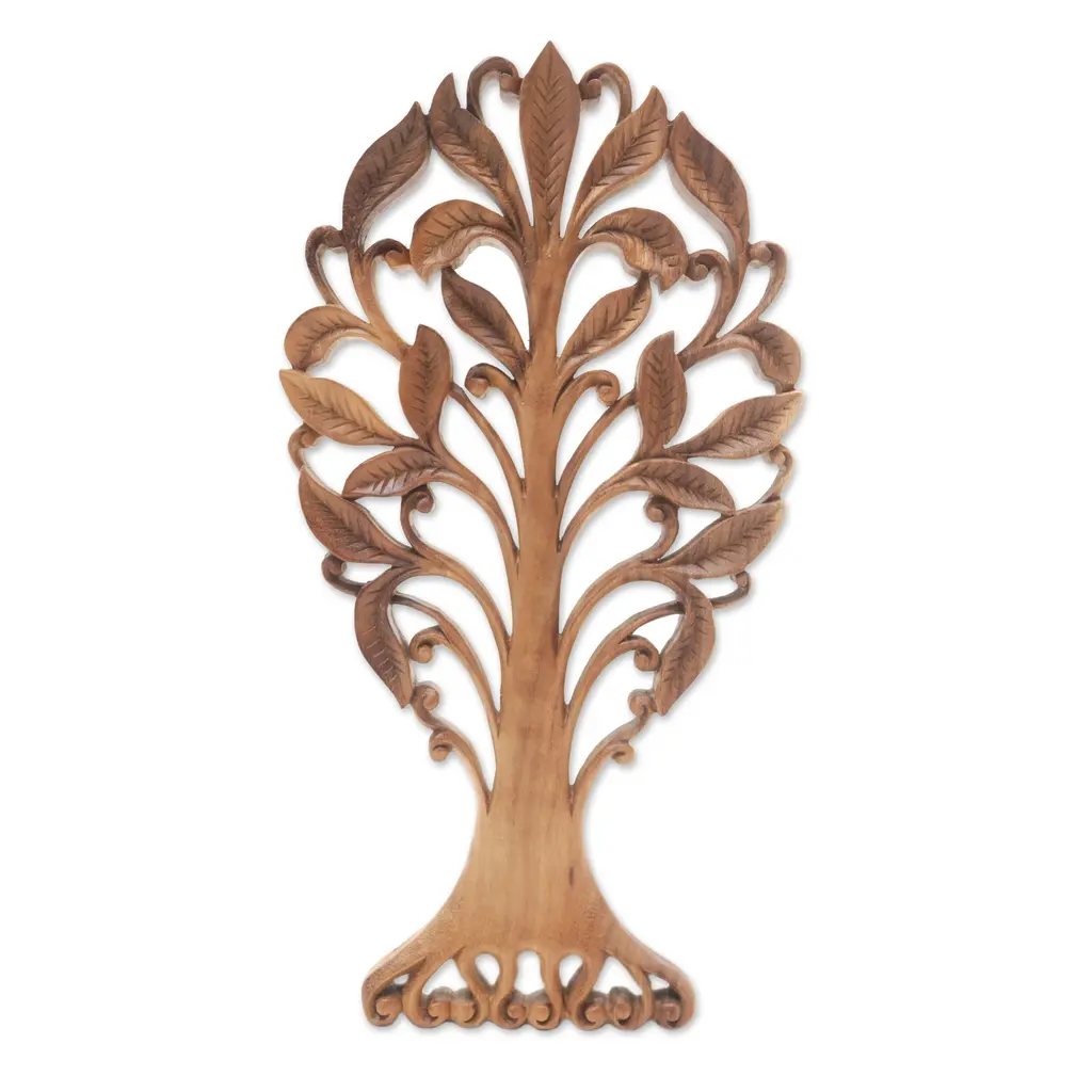Fascinated and inspired by nature, Bali's Sarwaedi creates a charming wall relief panel perfect for adding a warm touch to your environment. The artisan uses suar wood in a brown tone to bring a magical tree to life, featuring an intricate design of windy leaves and roots polished for an exquisite look.