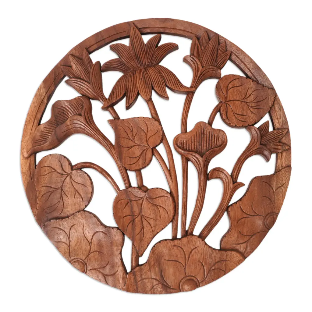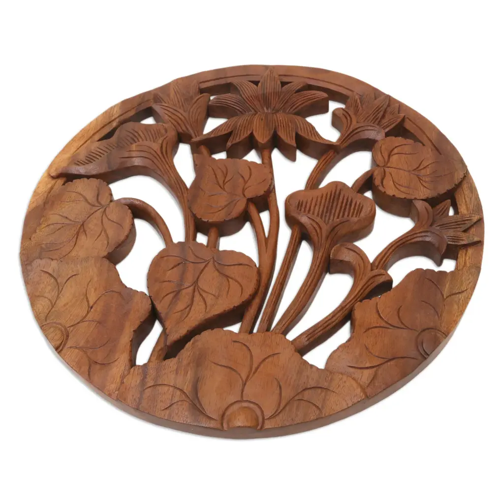 Flowers and leaves form a precious relief panel hand-carved from suar wood. Artisan Seji Taram makes each detail in her workshop in Bali, drawing inspiration from lotus flowers and pond leaves. The work comes in a natural brown tone and with a polished finish.