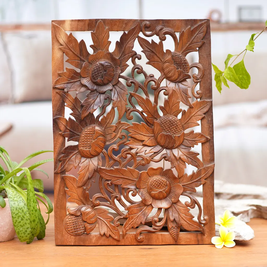 Hand-Carved Suar Wood Relief Panel With Flowers And Leaves- Floral Dream