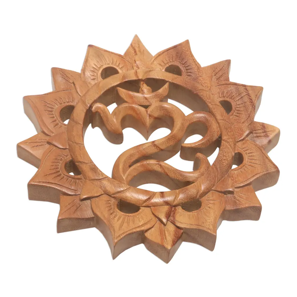 This hand-carved wood wall panel depicts the ancient Sanskrit letter, Om, a mantra used in Hindu and Buddhist prayer and meditation. Sunny motifs of carved, natural-colored suar wood surround the central Om character, used heavily in yoga as a centering, soul replenishing mantra. Make Sunnyside Om an addition to your decor and ensure this symbol of inner peace is centered in your home and your mind.
