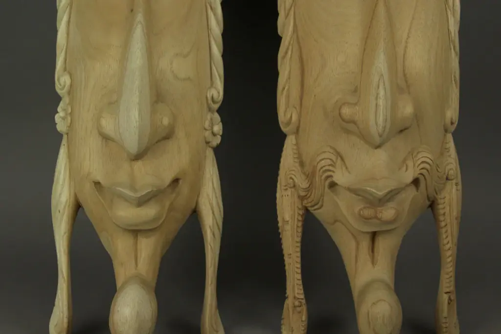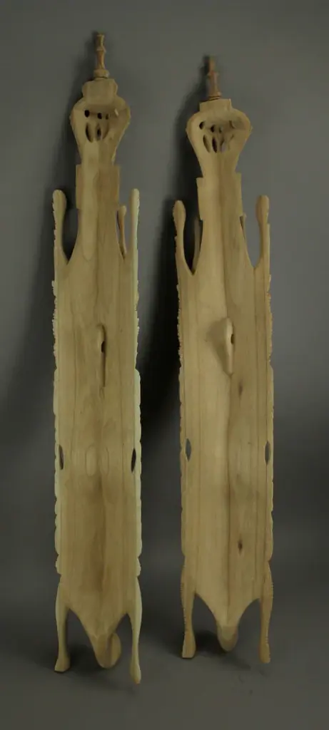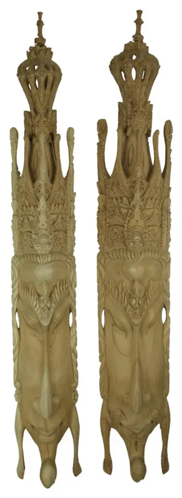 41.75 inch High, 6 inch Long, 2.75 inch WideBeautifully Handcrafted of Wood with Intricately Carved Details and a Finely Sanded Natural FinishHangs Easily Using the Hanger On the Back, Just Add String or Cord to Display AnywhereStunning Representations of the Hindu God and GoddessSince Each Mask is Hand Carved, Size and Wood Grain Colorations Will Vary Slightly by Each PieceThe two lovers of the Ramayana Epic, Rama and Sita, are beautifully represented in this wall mask set. Sita, the consort of Lord Rama, was kidnapped by the demon-king Ravana and brought to his island kingdom, until being rescued by Rama with the help of Hanuman and his monkey army. They later became king and queen. Their story discusses duties of relationships, rights and social responsibilities. Each mask is handcrafted from wood with intricately carved details in a finely sanded natural finish. They can be displayed anywhere, just add a bit of string or cord through the hanger on the back. Each piece measures approximately 41.75 inches high, 6 inches long and 2.75 inch wide. Since they are hand carved, size and wood grain colorations will vary slightly by piece.