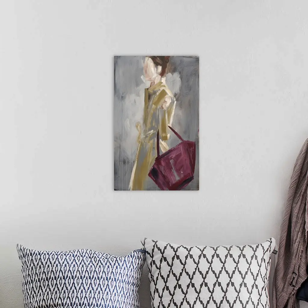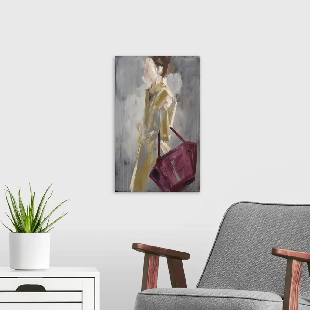 Contemporary artwork of a fashionable woman holding a red handbag.