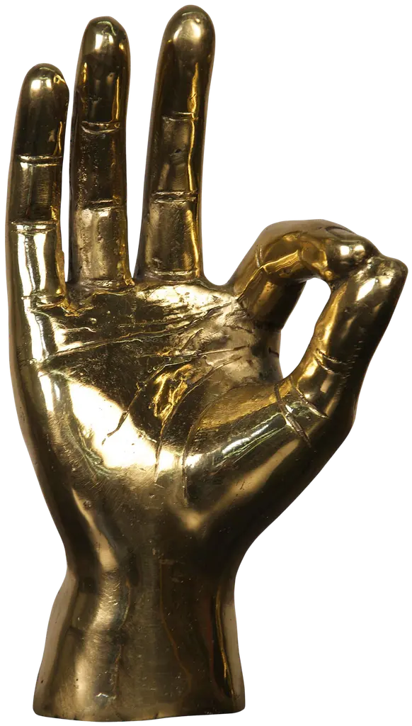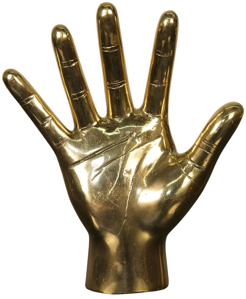 An open hand is rendered simply in an expertly weathered warm antique finish. Featuring raw, stylized lines, this intriguing brass wall accent is the perfect piece to add interest to any modern décor. Handcrafted of brass, no two will be identical.