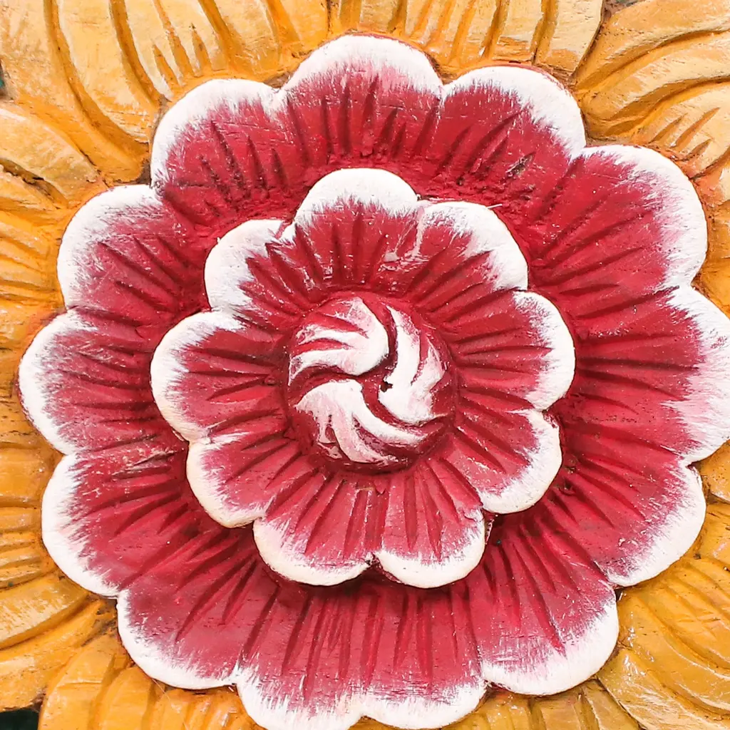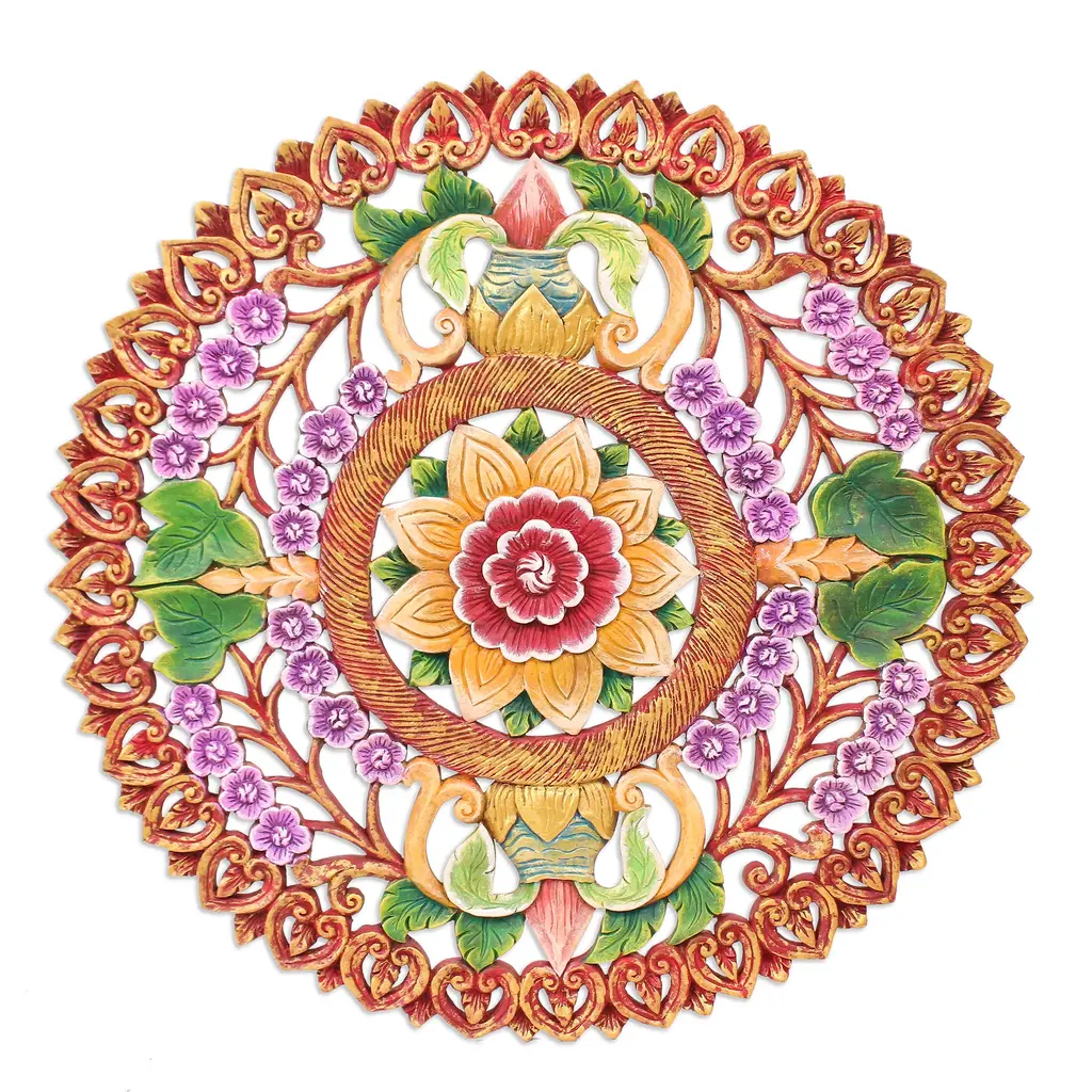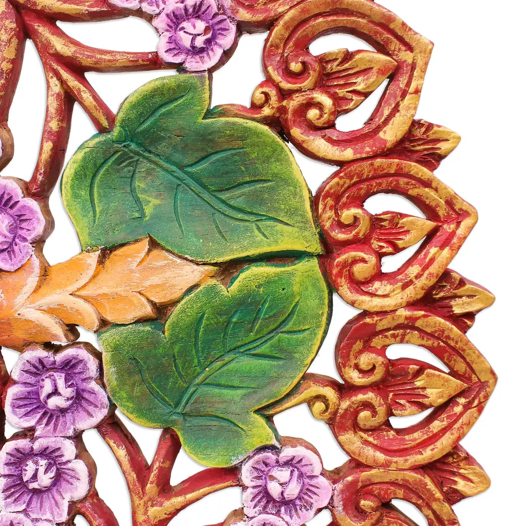 Hand Painted Circular Teak Wood Relief Panel From Thailand- Splendid Garden
