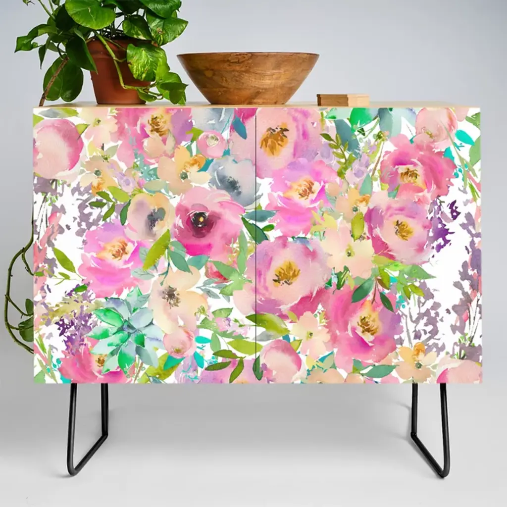 Hand Painted Pink Lavender Lilac Teal Watercolor Elegant Floral Credenza