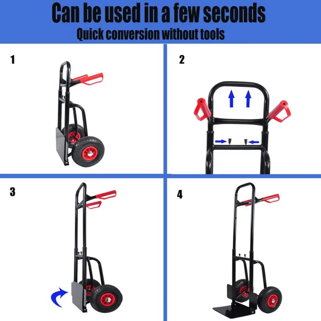 Convertible Design: The convertible design of this hand truck dolly offers versatility and convenience. By sliding the handle out of one set of tubes and into the other, you can easily convert it from a two-wheeled hand truck to a four-wheeled. Heavy Duty Construction: The construction of a hand truck dolly is made of sprayed metal, which provides durability and high strength. It is not easily deformed, ensuring long-lasting use. making it suitable for heavy-duty tasks. Quality Wheels: The hand truck is equipped with quality wheels to enhance its functionality. It features pneumatic tires for the main wheels and swivel casters for maneuverability. These wheels are designed to withstand heavy usage. Easy To Assemble&Carry: Assembling and carrying the hand truck is easy and straightforward. You only need to install the four wheels, and the assembly can be completed quickly following the provided instructions. Multiple Applications: This versatile hand truck dolly has multiple applications and can be used in various settings. It is suitable for both indoor and outdoor tasks, such as loading and unloading items or moving them around.