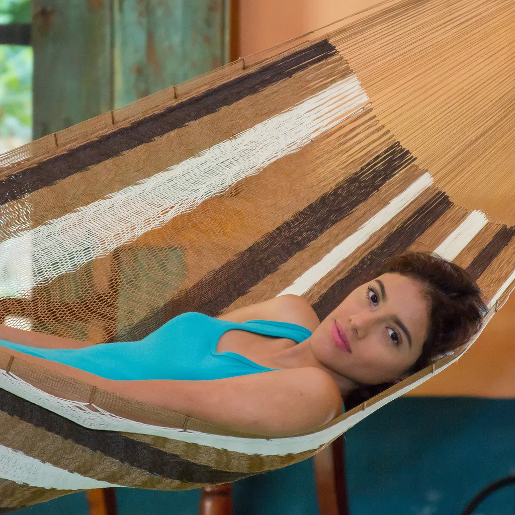 Delicious shades of brown tempt the senses and are destined to be enjoyed in a comfortable hammock during lazy summer days. Skilled Maya Artists of the Yucatan hand-weave this nylon hammock in rich coffee and chocolate brown. Long before the Spanish arrived upon the coasts of the Yucatan Peninsula, the Maya preferred to sleep and rest in hammocks. They considered the hammock to be like the loving embrace of a mother, due to the comfortable manner in which the body is held and swung within its cradle. Maya Artists of the Yucatan seek to preserve time-honored customs while also offering stylized versions of the original Maya hammock. For them, the hammock is a work of art. Their hammocks are incredibly comfortable, easy to maintain, and may be stored just about anywhere. Please note: The accompanying extension ropes may vary in color from those shown in the images.