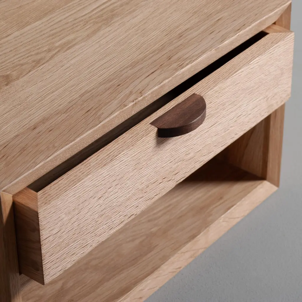 Hand-crafted pair of European oak floating night stand with black walnut accents and exposed through jointing details. Each with one drawer and a shelf below.Handmade in England. Custom dimensions are available upon request. These are wall mounted using the secure french cleat method.Finished in durable eco friendly oil.
