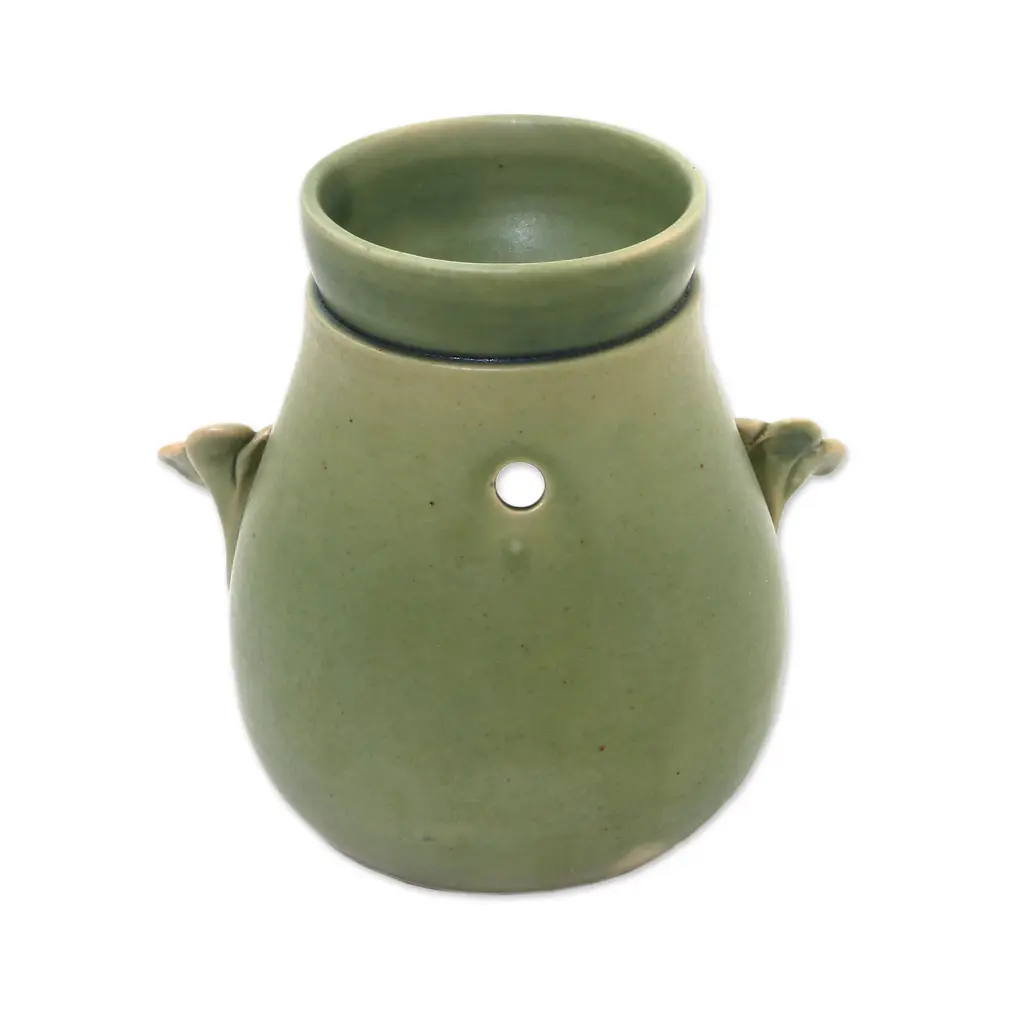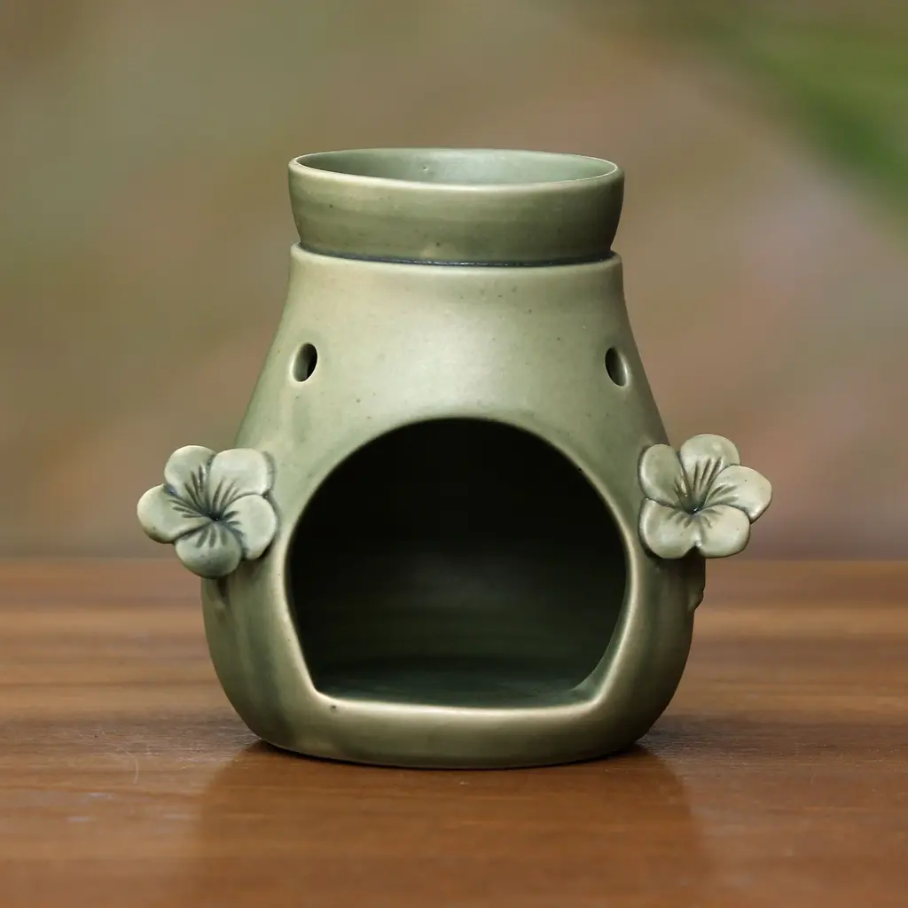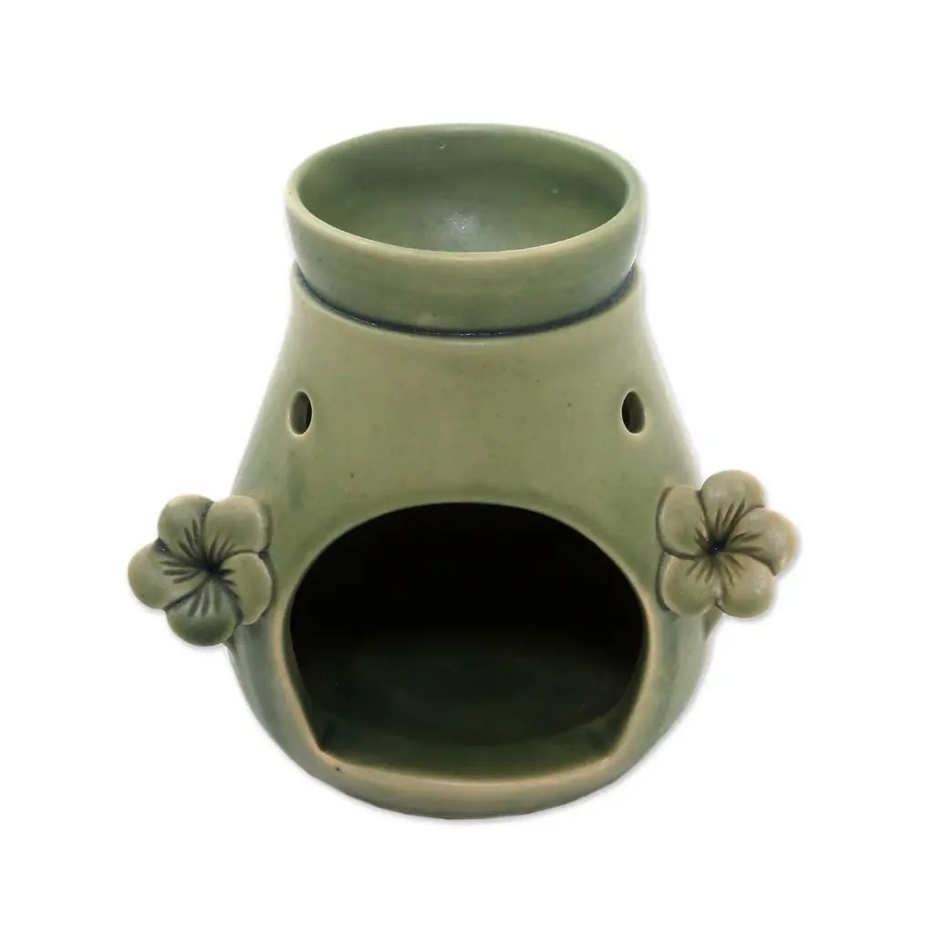 Handcrafted Green Floral Ceramic Oil Warmer From Bali- Frangipani Dreams