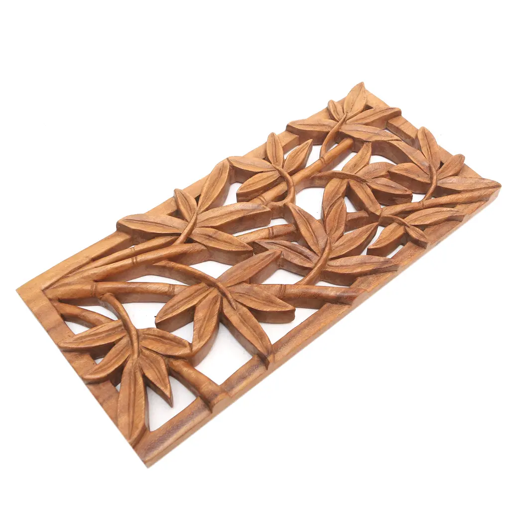 The five-finger tree inspires this admirable wall panel of natural beauty. From Eka in Bali, the panel is expertly carved by hand from suar wood, faithfully replicating the leaves' unique formation.