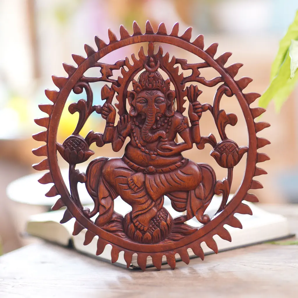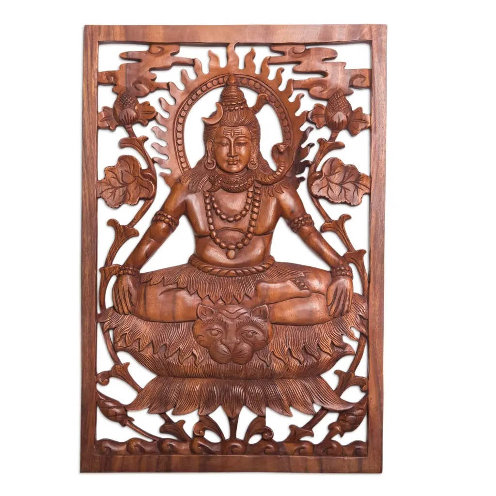 Designed by Wayan Nuliati in Bali, this handsome relief panel features the Hindu god Shiva sitting on a lotus flower. The artisan hand carves the openwork panel from local suar wood, crafting a tiger at his feet who symbolizes the god's wife, goddess Durga.