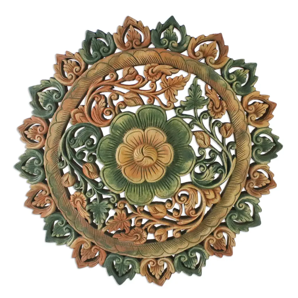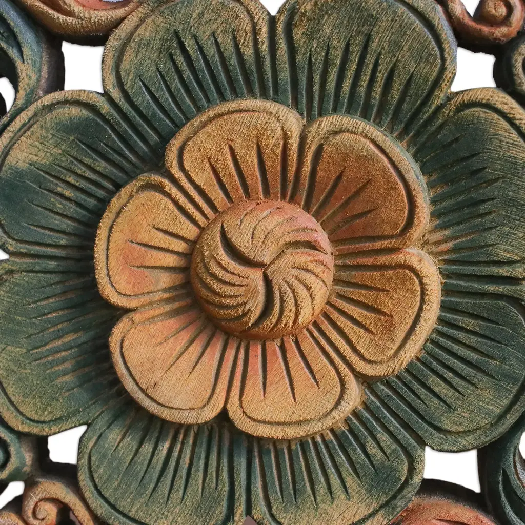 A graceful blossom opens its vibrant petals. Surrounded by curling branches and leaves, this flower resembles a radiant star. Tay Nontawat carves this panel from two pieces of teak wood; he works with manual tools that allow him to achieve sublime detailing. After the wood has dried in the sun, he colors the panel with lacquer paints. Due to the handcrafted nature of this product, there could be slight difference in color. It could also present a rough finished, which is Nontawat's intention as it serves to emphasize the original appeal of this piece.