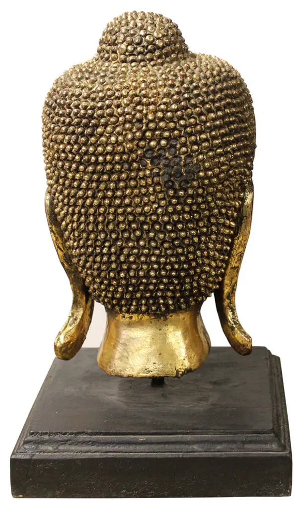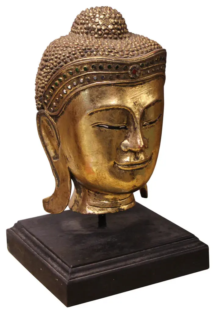 Master handcrafted Buddha head on stand, this statue is carved with solid wood painted with gold color, decorate with color stone. Buddha is in deep meditation with full wisdom. It is a great table top display statue for any room, good for Feng Shui and reminder for our daily life. Dimension: w6.75" x 7.5" x h12" (on stand 15.25")Origin: ChinaMaterial: Wood