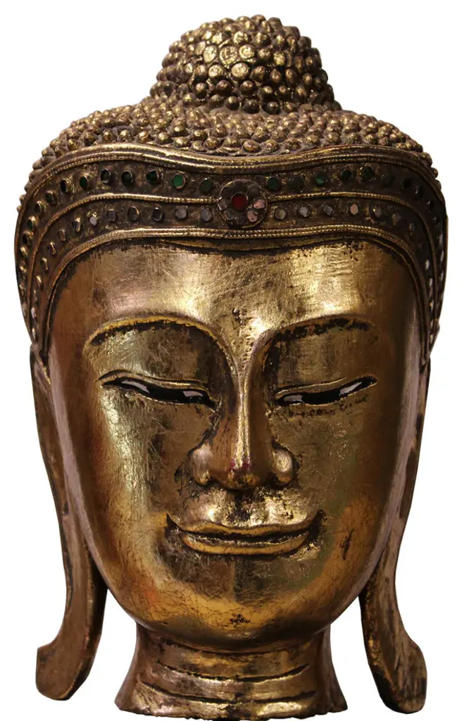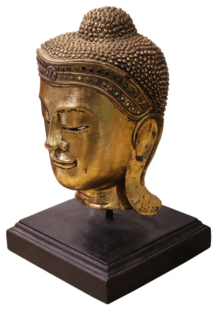 Handcrafted Wood Gold Color Serene Peaceful Meditate Buddha Head On Stand Hn271