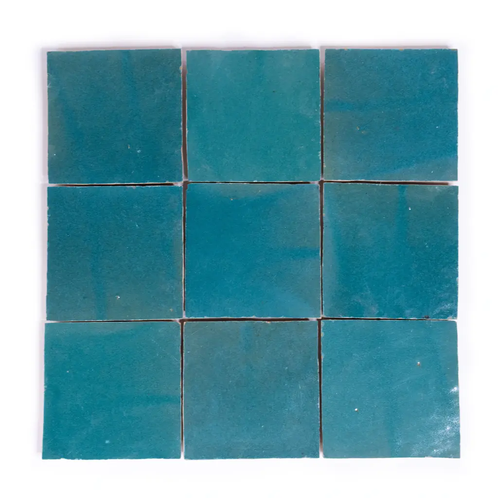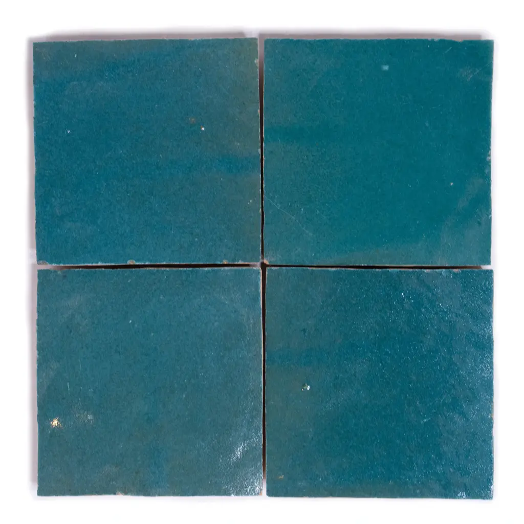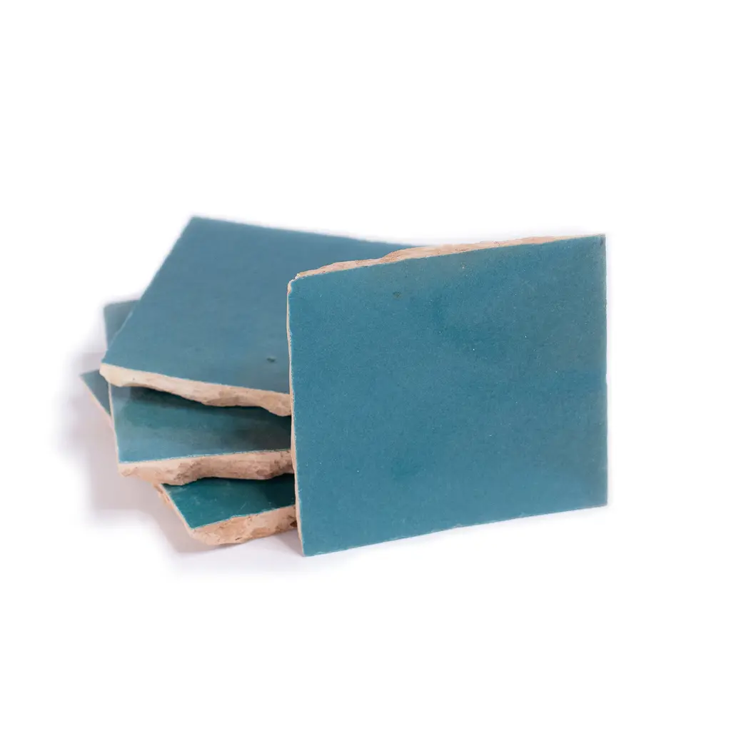 Elevate your space with the timeless beauty of traditional Moroccan Zelig tiles! Our Handmade 4x4-in Moroccan Mosaic Solid Color tiles are meticulously crafted by skilled Moroccan artisans using high-quality clay. These glossy tiles are perfect for both indoor and outdoor use and are environmentally responsible and resource efficient. With low maintenance and durability, these tiles are sure to add a touch of elegance to any floor or wall . Features: · Brand: Moroccan Mosaic and Tile House· 100%Handmade in Morocco by skilled artisans· Made of high-quality clay for durability· Suitable for indoor and outdoor use· Glossy finish adds a touch of elegance.· Environmentally responsible and resource efficient· Type/Style: Floor and Wall Tile· Color: Turquoise· Materials: Made of clay. Dimensions: 4in x 4in (each), covers 5.33 Sq. Ft/box· Pack/Case of 48 tiles. Story Behind the Art: "It's more than tile, it's art." That simple statement is what sets the craftsmanship of Moroccan Mosaic apart from the rest. Based in the small city of Sale, Moroccan Mosaic is a family business going back 4 generations. When Simo, the current head of the business graduated from university in New York, he had little interest in the family business. But on a return trip home, he saw that the business was not doing well and set about reviving it. One important change he made was introducing black, grey, and white designs to appeal to American and European customers. It worked. When he started, they employed 2 workers and now they have nearly 80 on staff. The workshop itself is simple, and the techniques used to create the tiles are steeped in tradition. Some modern equipment is available, though the workers prefer to use the more rustic tools. The creative process is time intensive and done by hand, as Simo insists on no corners be cut or production be rushed. Environmentally responsible and resource efficient, no chemicals are used at any step. For example, colors used come from nature literally. Green comes from mint leaves, orange from orange peel, and black from charcoal. The tiles themselves are a simple mixture of cement, sand, and granite powder. Moroccan Mosaic hires only local workers, teaching them a valued skill as well as paying them fair wages. Simo's goals for his business are to share the tradition of gorgeous Moroccan tile, grow the business, and employ more and more workers.