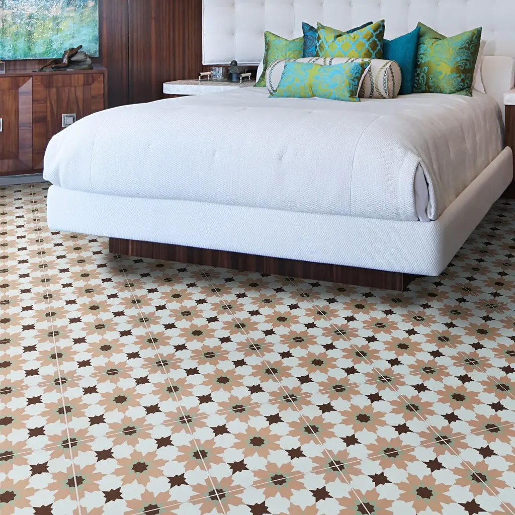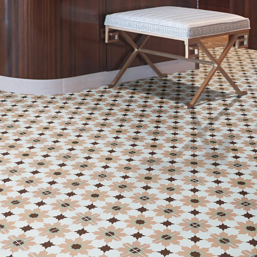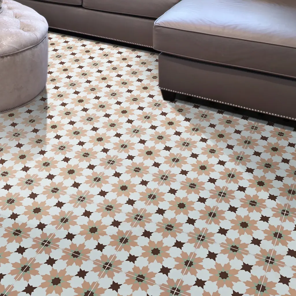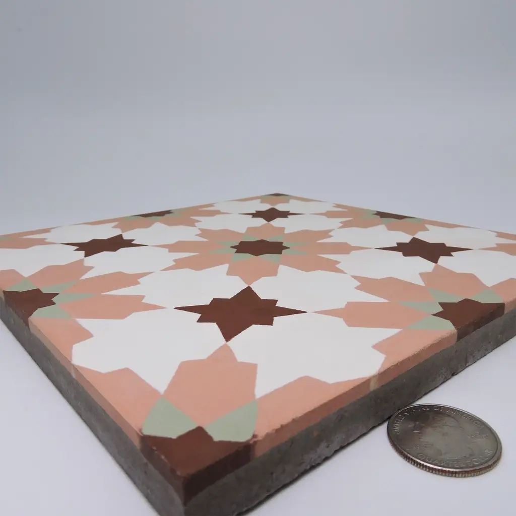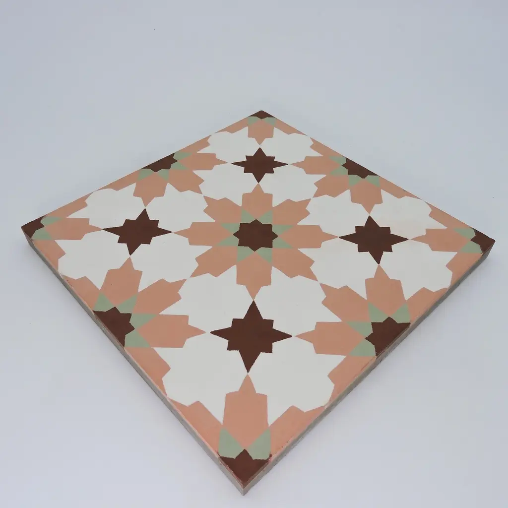 Beautify your walls or floors with exotic geometric design of this pack of Ahfir Moroccan pink, green, and brown wall tiles. These 8-inch by 8-inch tiles are handmade with cement for strength and durability booth indoors and outdoors. Professional installation is recommended for the best results. Story Behind the Art: "It's more than tile, it's art." That simple statement is what sets the craftsmanship of Moroccan Mosaic apart from the rest. Based in the small city of Sale, Moroccan Mosaic is a family business going back 4 generations. When Simo, the current head of the business graduated from university in New York, he had little interest in the family business. But on a return trip home, he saw that the business was not doing well and set about reviving it. One important change he made was introducing black, grey, and white designs to appeal to American and European customers. It worked. When he started, they employed 2 workers and now they have nearly 80 on staff. The workshop itself is fairly simple, and the techniques used to create the tiles are steeped in tradition. Some modern equipment is available, though the workers prefer to use the more rustic tools. The creative process is time intensive and done by hand, as Simo insists on no corners be cut or production be rushed. Environmentally responsible and resource efficient, no chemicals are used at any step. For example, colors used come from nature literally. Green comes from mint leaves, orange from orange peel, and black from charcoal. The tiles themselves are a simple mixture of cement, sand, and granite powder. Moroccan Mosaic hires only local workers, teaching them a valued skill as well as paying them fair wages. Simo's goals for his business are to share the tradition of gorgeous Moroccan tile, grow the business, and employ more and more workers.