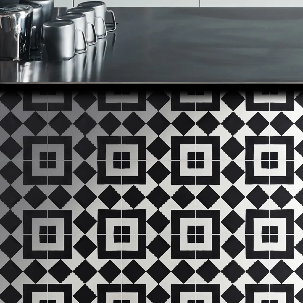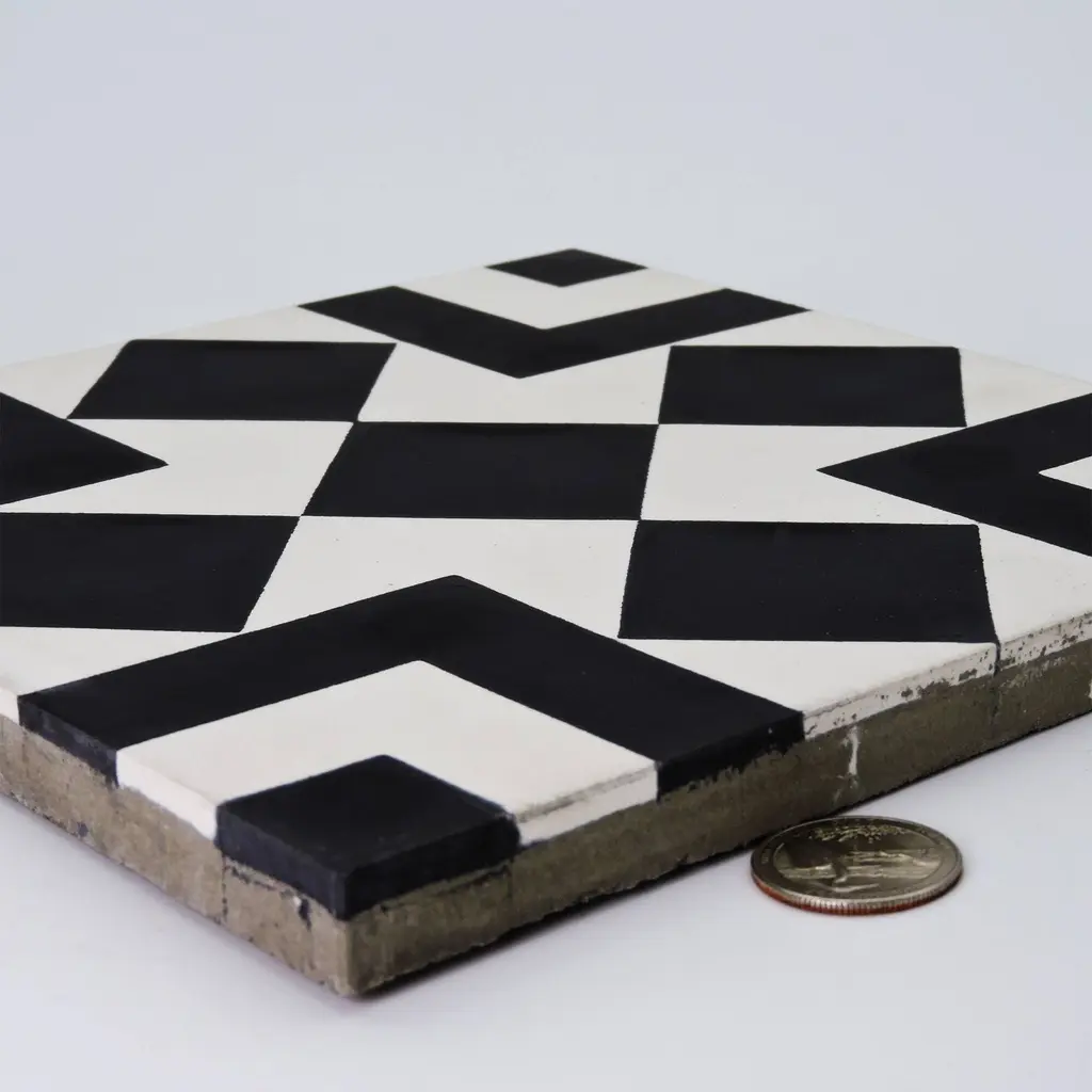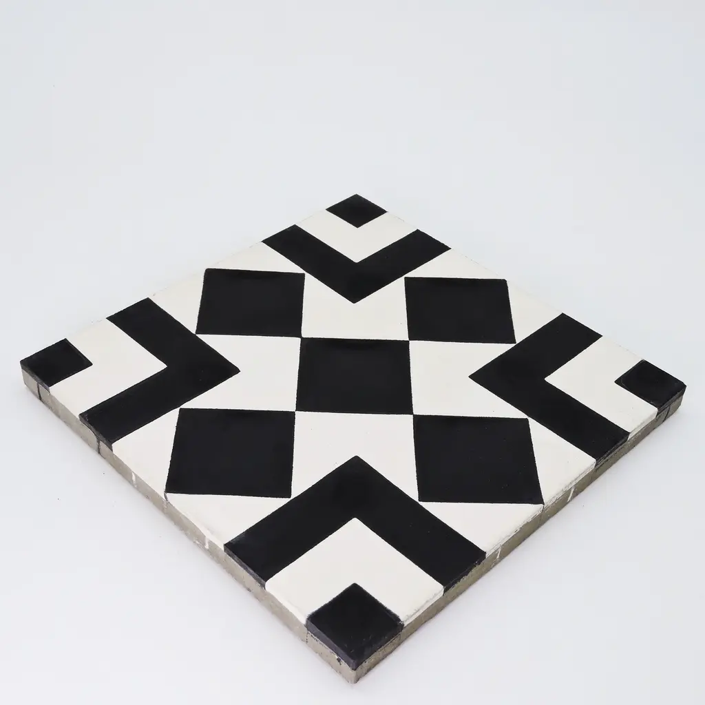Replace your old, floor or wall tile with this pack of twelve cement tiles. Handmade in Morocco with a unique geometric design in a combination of white and black colors, these tiles are sure to liven up any living space. Product Features:Story Behind the Art:"It's more than tile, it's art." That simple statement is what sets the craftsmanship of Moroccan Mosaic apart from the rest. Based in the small city of Sale, Moroccan Mosaic is a family business going back 4 generations. When Simo, the current head of the business graduated from university in New York, he had little interest in the family business. But on a return trip home, he saw that the business was not doing well and set about reviving it. One important change he made was introducing black, grey, and white designs to appeal to American and European customers. It worked. When he started, they employed 2 workers and now they have nearly 80 on staff. The workshop itself is fairly simple, and the techniques used to create the tiles are steeped in tradition. Some modern equipment is available, though the workers prefer to use the more rustic tools. The creative process is time intensive and done by hand, as Simo insists on no corners be cut or production be rushed. Environmentally responsible and resource efficient, no chemicals are used at any step. For example, colors used come from nature literally. Green comes from mint leaves, orange from orange peel, and black from charcoal. The tiles themselves are a simple mixture of cement, sand, and granite powder. Moroccan Mosaic hires only local workers, teaching them a valued skill as well as paying them fair wages. Simo's goals for his business are to share the tradition of gorgeous Moroccan tile, grow the business, and employ more and more workers.
