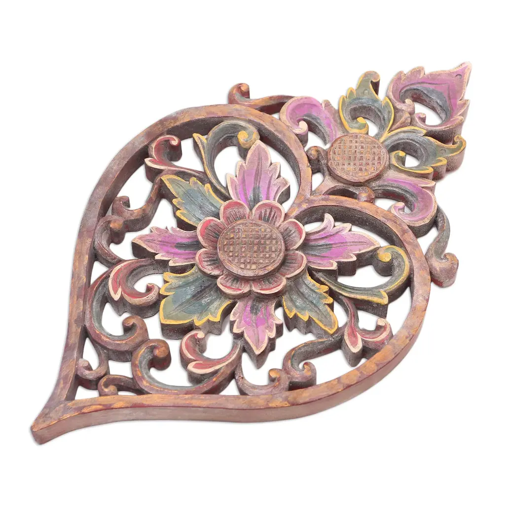 Balinese artisan Ketut Sudantara combines colorful acrylic paint with shimmering gilt to create a unique metallic finish on this stunning relief panel. Crafted from local suar wood, the panel features a majestic lotus flower at the center of a heart-shaped frame.