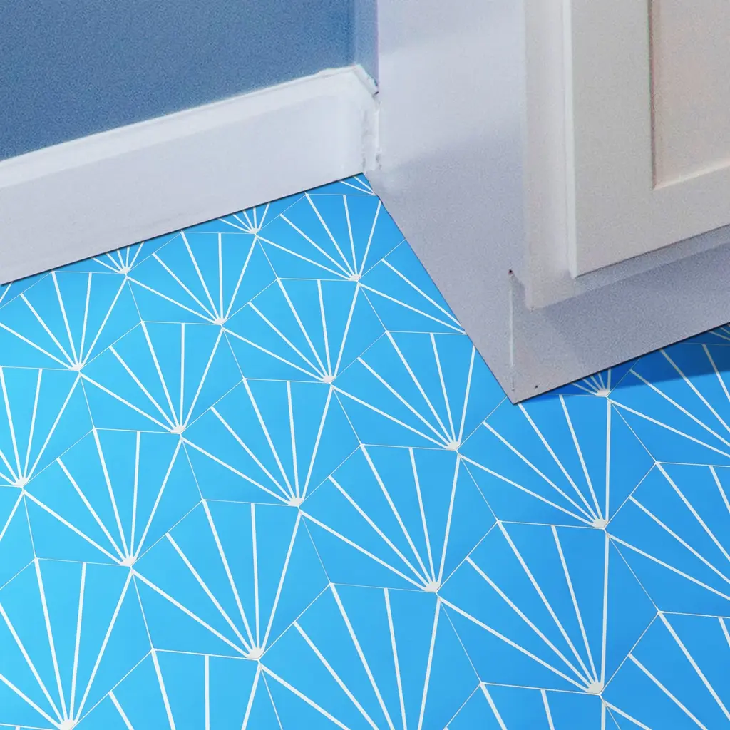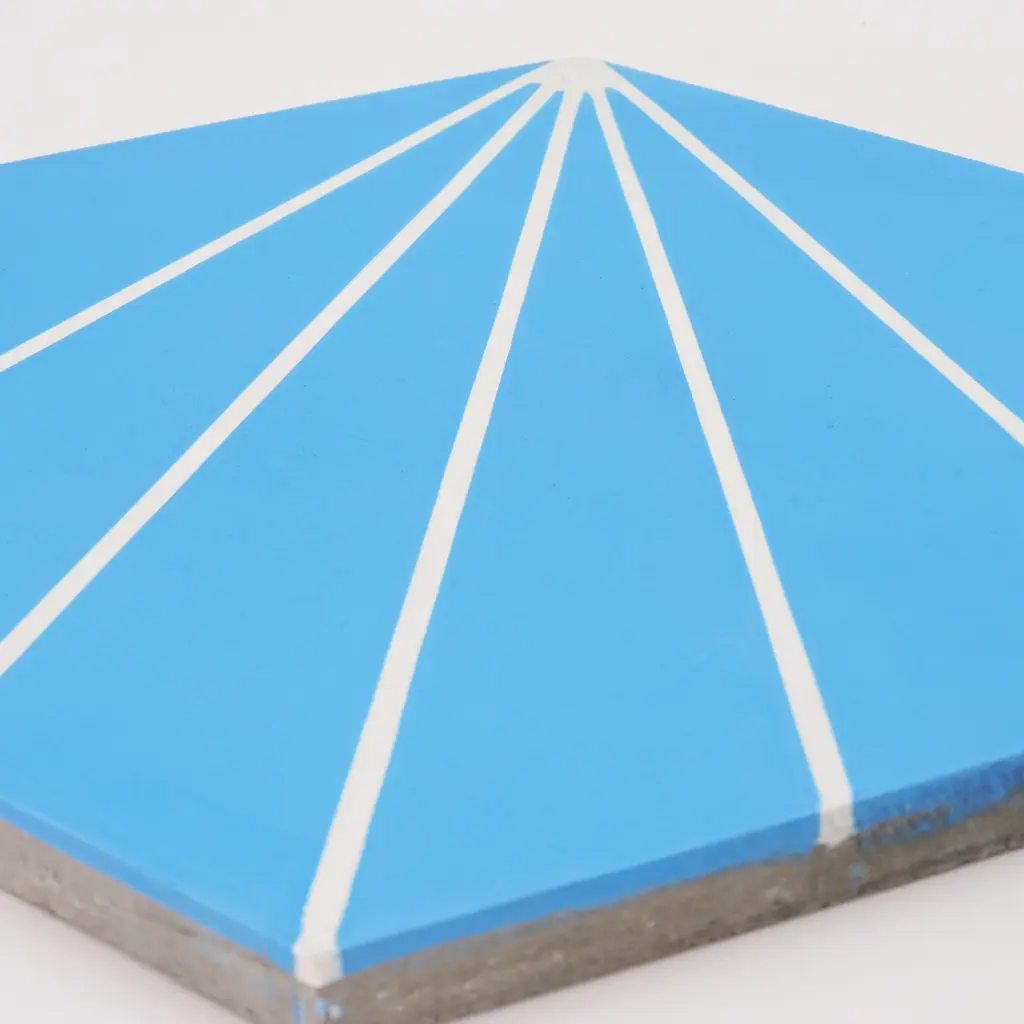 This playful geometric pattern will work well in both contemporary and traditional environments. The graphic Blue and White tiles can be enjoyed both indoors and outdoors for many years. The handmade tiles are constructed by environmentally responsible and resource efficient means, to offer a distinct perspective on traditional Moroccan tile work.Features:- Pack of 12 tiles when ordering a box (8x9), Sample is 1 tile only, max of 4 samples allowed- Crafted in Morocco- Moroccan Mosaic and Tile House Brand- Floor and Wall tiles- Eco-friendly- Handmade- Cement, Granite- Blue and White lines- Commercial and Residential use.- Outdoor or Indoor Use.- 4.44 square feet per Carton- Tile measures 8 inches long x 9 Inches wide x 0.5 inches thick - Installation: Easy to install; It is recommended you purchase a minimum of 10% overage to account for design cuts and patterns.Story Behind the Art: "It's more than tile, it's art." That simple statement is what sets the craftsmanship of Moroccan Mosaic apart from the rest. Based in the small city of Sale, Moroccan Mosaic is a family business going back 4 generations. When Simo, the current head of the business graduated from university in New York, he had little interest in the family business. But on a return trip home, he saw that the business was not doing well and set about reviving it. One important change he made was introducing black, grey, and white designs to appeal to American and European customers. It worked. When he started, they employed 2 workers and now they have nearly 80 on staff. The workshop itself is fairly simple, and the techniques used to create the tiles are steeped in tradition. Some modern equipment is available, though the workers prefer to use the more rustic tools. The creative process is time intensive and done by hand, as Simo insists on no corners be cut or production be rushed. Environmentally responsible and resource efficient, no chemicals are used at any step. For example, colors used come from nature literally. Green comes from mint leaves, orange from orange peel, and black from charcoal. The tiles themselves are a simple mixture of cement, sand, and granite powder. Moroccan Mosaic hires only local workers, teaching them a valued skill as well as paying them fair wages. Simo's goals for his business are to share the tradition of gorgeous Moroccan tile, grow the business, and employ more and more workers.