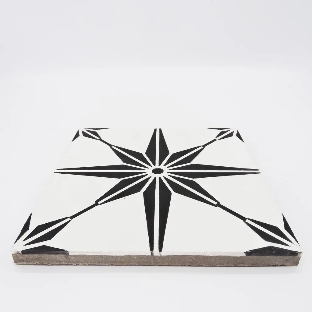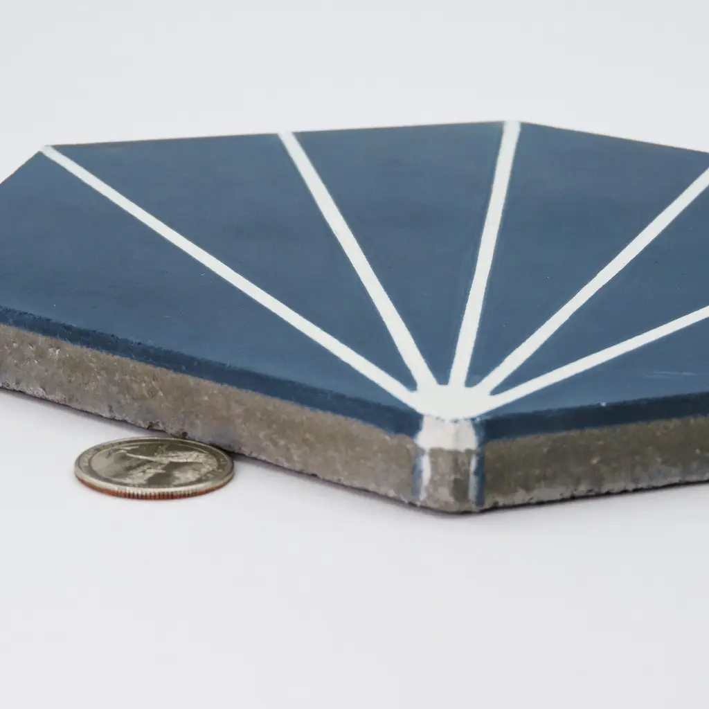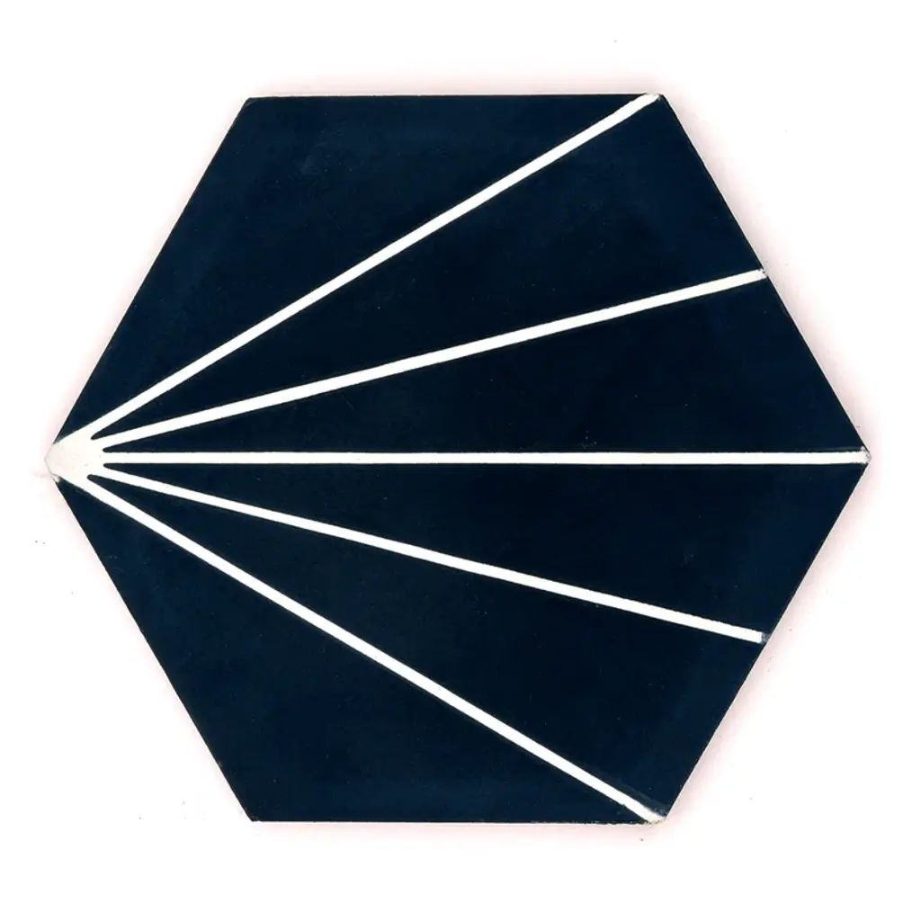 Add a touch of Moroccan style to your indoor or outdoor space with these Handmade Menara tiles. The navy blue and white geometric pattern is perfect for any décor, traditional or modern. These eco-friendly tiles are crafted by skilled artisans in Morocco using resource-efficient methods. Each tile is handmade and may vary slightly in size, color, and design, adding to their unique charm. These versatile tiles can be used on floors and walls in commercial or residential spaces.Features:Story Behind the Art: "It's more than tile, it's art." That simple statement is what sets the craftsmanship of Moroccan Mosaic apart from the rest. Based in the small city of Sale, Moroccan Mosaic is a family business going back 4 generations. When Simo, the current head of the business graduated from university in New York, he had little interest in the family business. But on a return trip home, he saw that the business was not doing well and set about reviving it. One important change he made was introducing black, grey, and white designs to appeal to American and European customers. It worked. When he started, they employed 2 workers and now they have nearly 80 on staff. The workshop itself is fairly simple, and the techniques used to create the tiles are steeped in tradition. Some modern equipment is available, though the workers prefer to use the more rustic tools. The creative process is time intensive and done by hand, as Simo insists on no corners be cut or production be rushed. Environmentally responsible and resource efficient, no chemicals are used at any step. For example, colors used come from nature literally. Green comes from mint leaves, orange from orange peel, and black from charcoal. The tiles themselves are a simple mixture of cement, sand, and granite powder. Moroccan Mosaic hires only local workers, teaching them a valued skill as well as paying them fair wages. Simo's goals for his business are to share the tradition of gorgeous Moroccan tile, grow the business, and employ more and more workers.