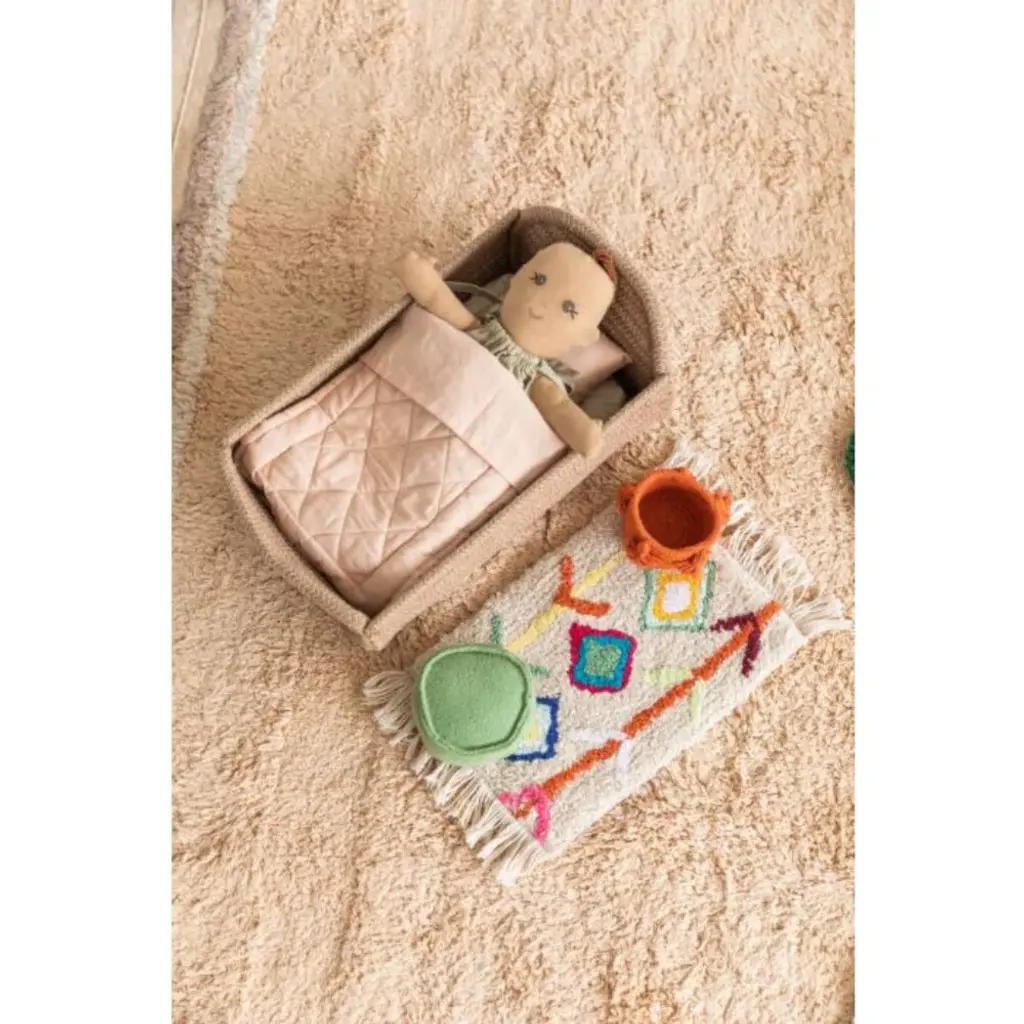 Make believe play has never been sweeter! This adorable handcrafted textile doll is a great way to inspire imaginative play. This tiny doll, named "Sana" comes with a comfy crib, Azteca rug, a tassel basket and a pouf.