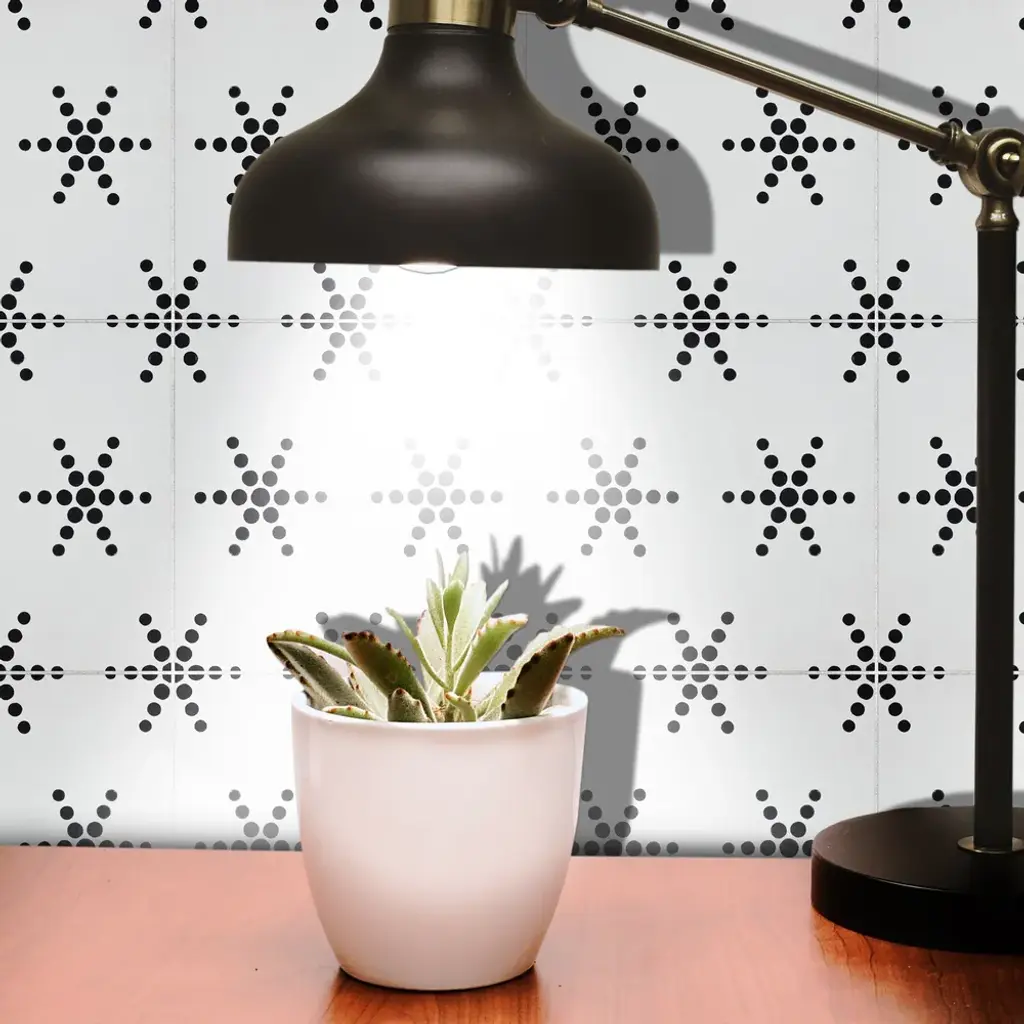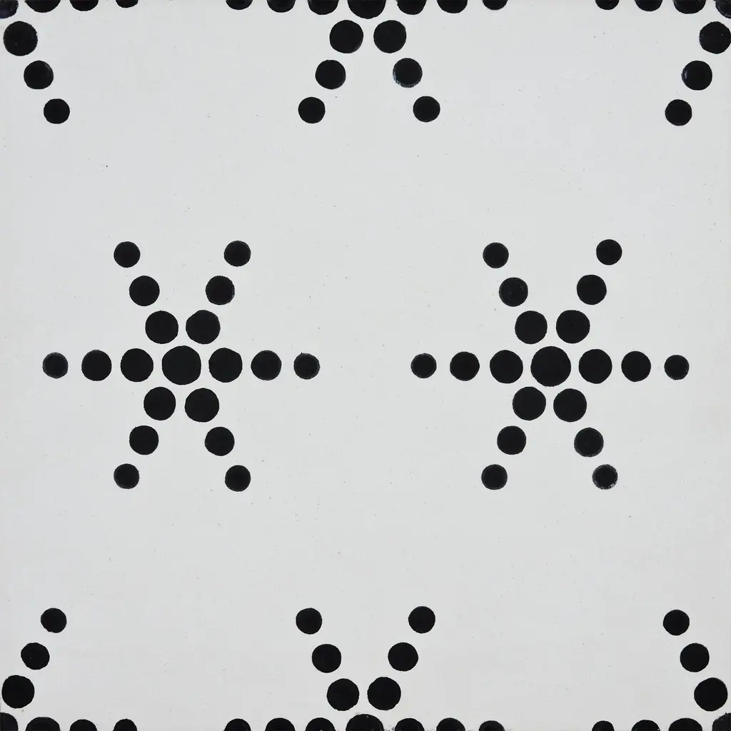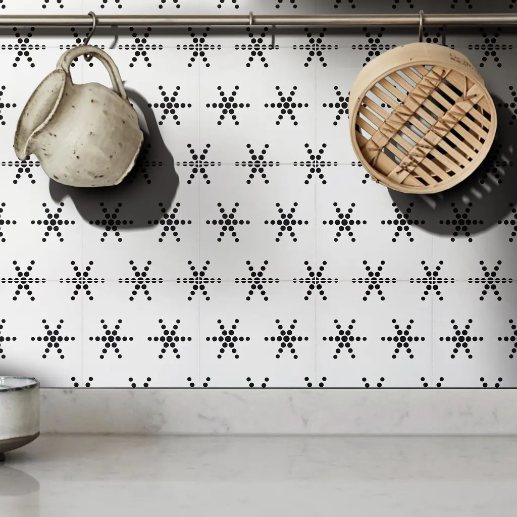 Elevate your home's style with this pack of 12 Paris Moroccan tiles. The black starburst pattern on a white background adds a touch of mid-century modern design to your kitchen. These handmade tiles from Morocco are crafted with cement and granite, ensuring durability for both wall and floor use.Features:· Handmade in Morocco· Moroccan Mosaic and Tile House Brand· Decorative floor and wall tiles· Made of cement materials· Professional installation is recommended.· Tiles need to be sealed before and after grouting.· Eco-friendly· Indoor or outdoor use· Geometric pattern· When ordering a box, 12 tiles come included. Sample is just 1 tile.· 12 tiles per box, covering 5.22 square feet.· 2.3 tiles per square foot· Each tile measures 8 inches wide x 8 inches long· Story Behind the Art: "It's more than tile, it's art." That simple statement is what sets the craftsmanship of Moroccan Mosaic apart from the rest. Based in the small city of Sale, Moroccan Mosaic is a family business going back 4 generations. When Simo, the current head of the business graduated from university in New York, he had little interest in the family business. But on a return trip home, he saw that the business was not doing well and set about reviving it. One important change he made was introducing black, grey, and white designs to appeal to American and European customers. It worked. When he started, they employed 2 workers and now they have nearly 80 on staff. The workshop itself is fairly simple, and the techniques used to create the tiles are steeped in tradition. Some modern equipment is available, though the workers prefer to use the more rustic tools. The creative process is time intensive and done by hand, as Simo insists on no corners be cut or production be rushed. Environmentally responsible and resource efficient, no chemicals are used at any step. For example, colors used come from nature literally. Green comes from mint leaves, orange from orange peel, and black from charcoal. The tiles themselves are a simple mixture of cement, sand, and granite powder. Moroccan Mosaic hires only local workers, teaching them a valued skill as well as paying them fair wages. Simo's goals for his business are to share the tradition of gorgeous Moroccan tile, grow the business, and employ more and more workers.
