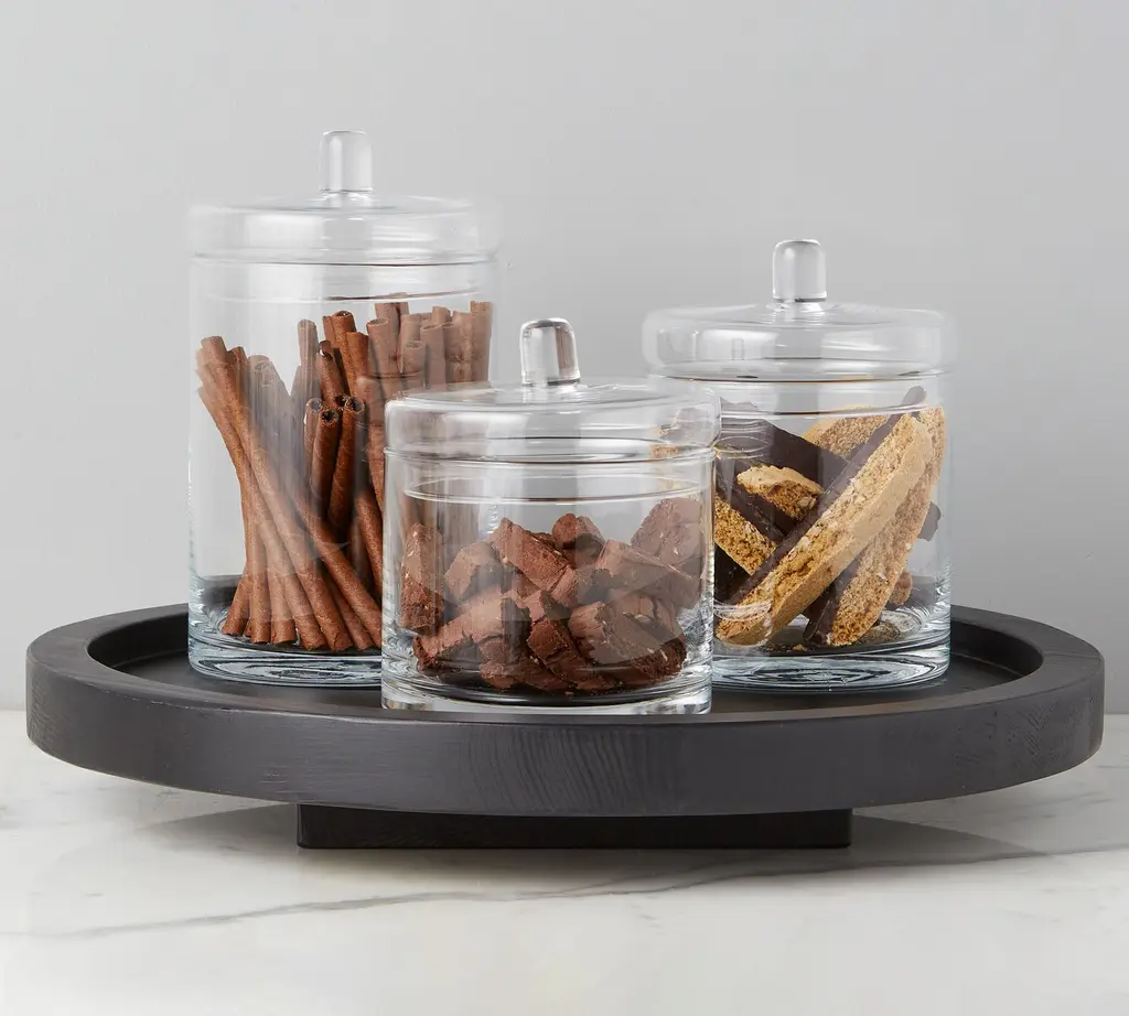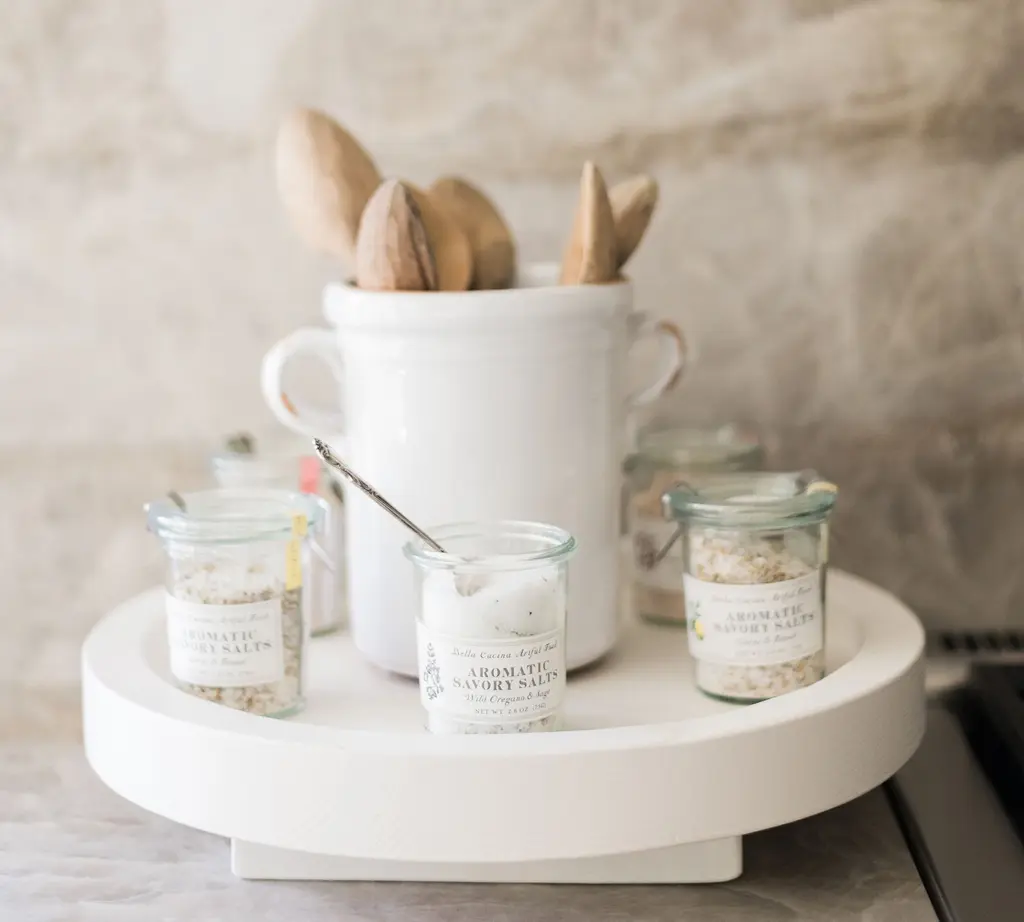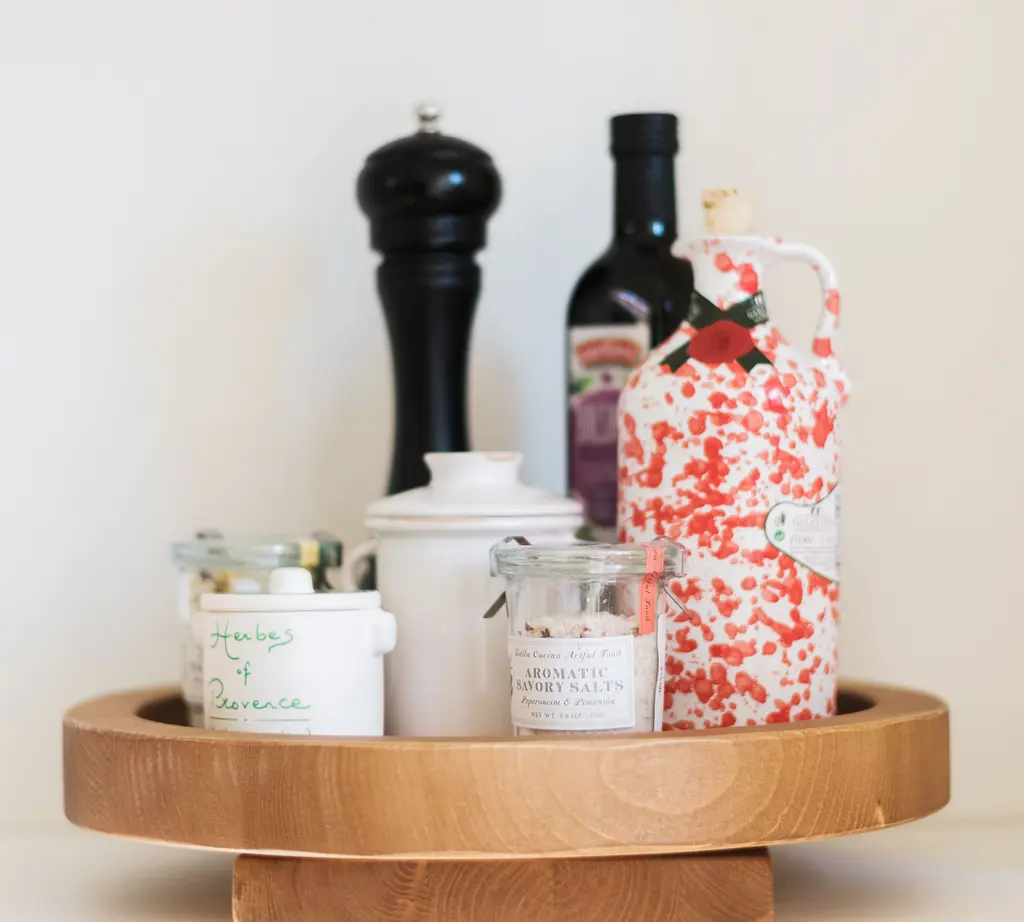 A 360 lazy Susan is both a pantry organizer (finding sage and basil is so much simpler) and a tool for making table shares easier. Use one at a time serving tapas, or nest one in the other for a tiered presentation. Handcrafted of reclaimed pine wood, each piece has the natural charm of one-of-kind markings.