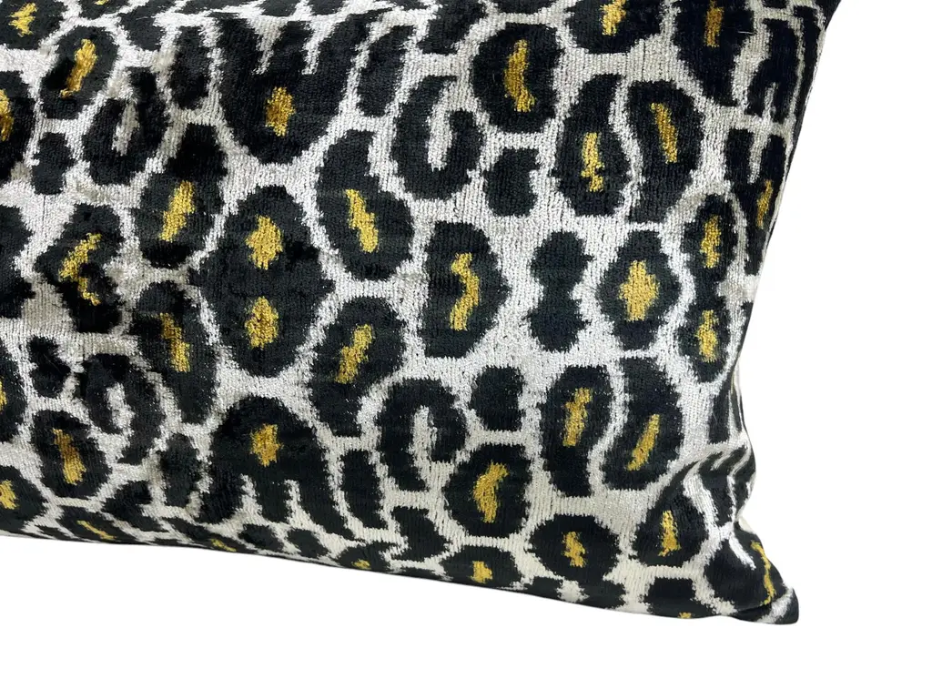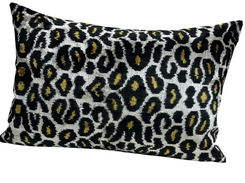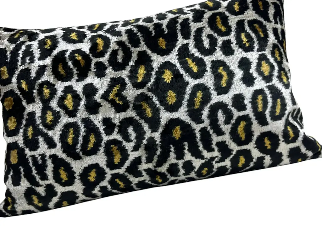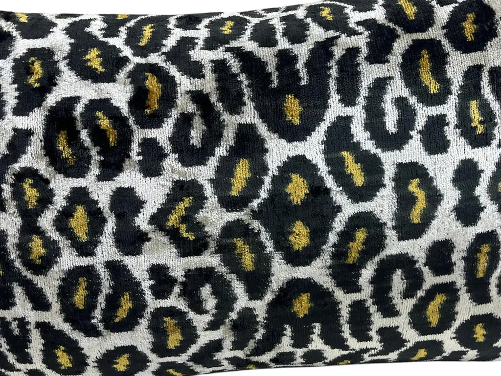 Handmade Velvet Silk IKAT cushion cover with leopard design and catchy color. It can be a perfect gift for animal lovers. This pillow case features a luxurious silk velvet fabric with an ikat pattern, adding a touch of elegance and sophistication to any space. The unique weaving technique of ikat creates a striking, artistic design, while the softness of the silk velvet ensures both comfort and visual appeal. Perfect for accenting your living room, bedroom, or any area in need of a stylish, refined statement piece. 16" 24" Inc / (40x60cm) Care: Dry Cleaning Cushion insert is not included