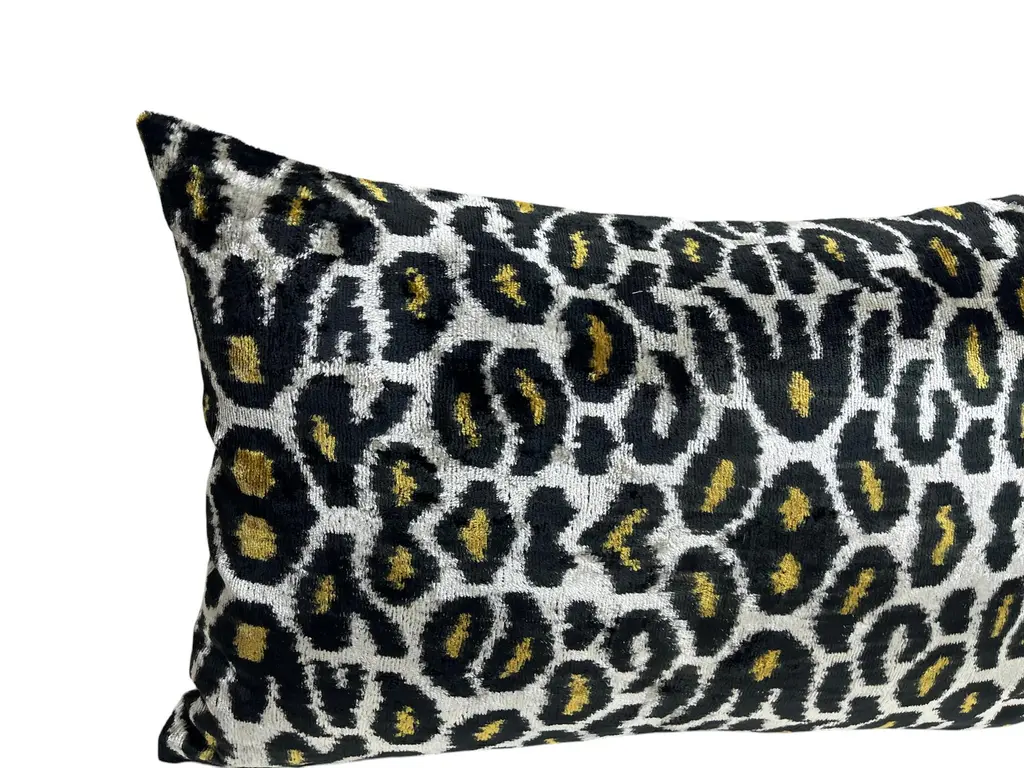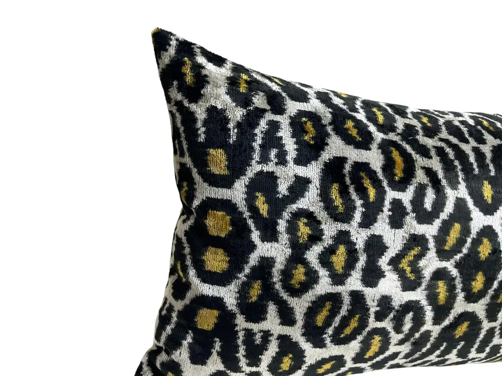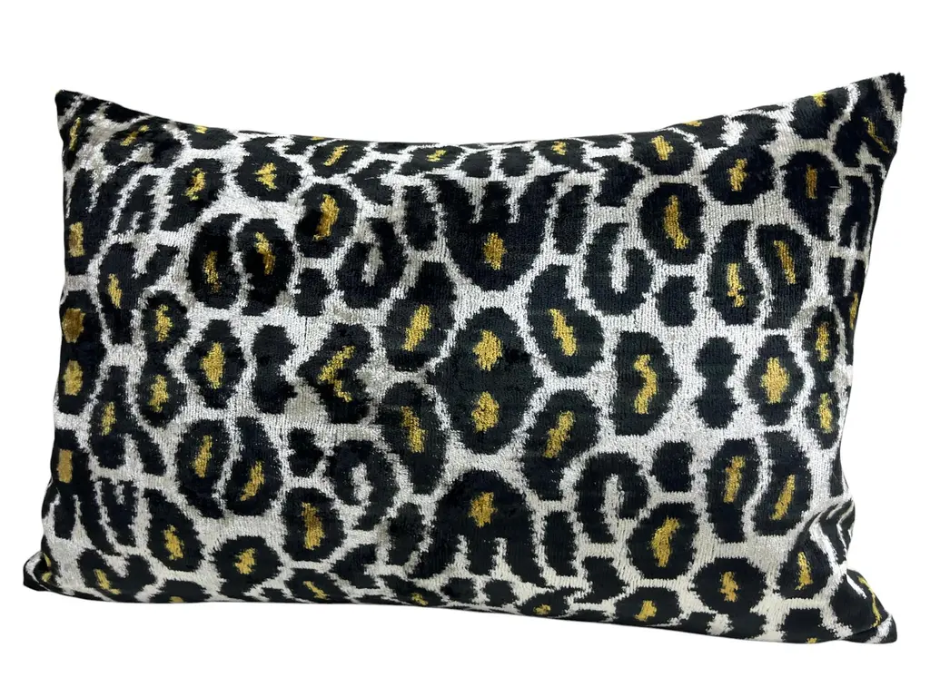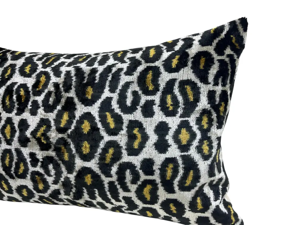 Handmade Velvet Silk IKAT cushion cover with leopard design and catchy color. It can be a perfect gift for animal lovers. This pillow case features a luxurious silk velvet fabric with an ikat pattern, adding a touch of elegance and sophistication to any space. The unique weaving technique of ikat creates a striking, artistic design, while the softness of the silk velvet ensures both comfort and visual appeal. Perfect for accenting your living room, bedroom, or any area in need of a stylish, refined statement piece. 16" 24" Inc / (40x60cm) Care: Dry Cleaning Cushion insert is not included