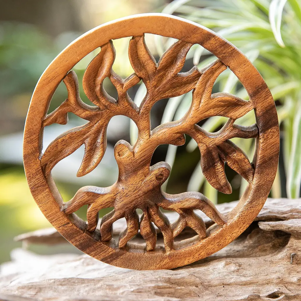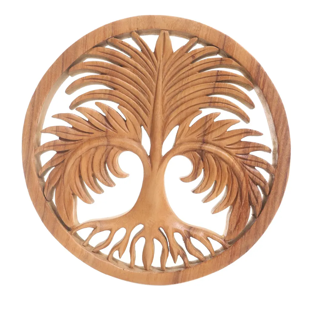 Bring the tropics into your home with Balinese artisan Made Mulyani's beautiful relief panel. Hand carved from local suar wood, the round panel features an openwork palm tree motif at the center of its slender frame. A polished finish gives the wood a beautiful luster.