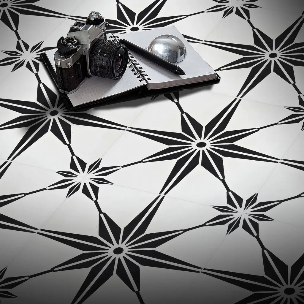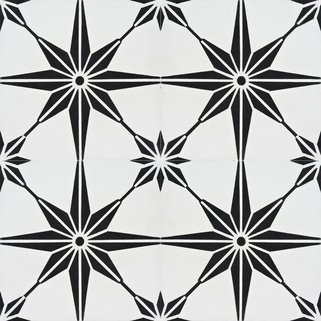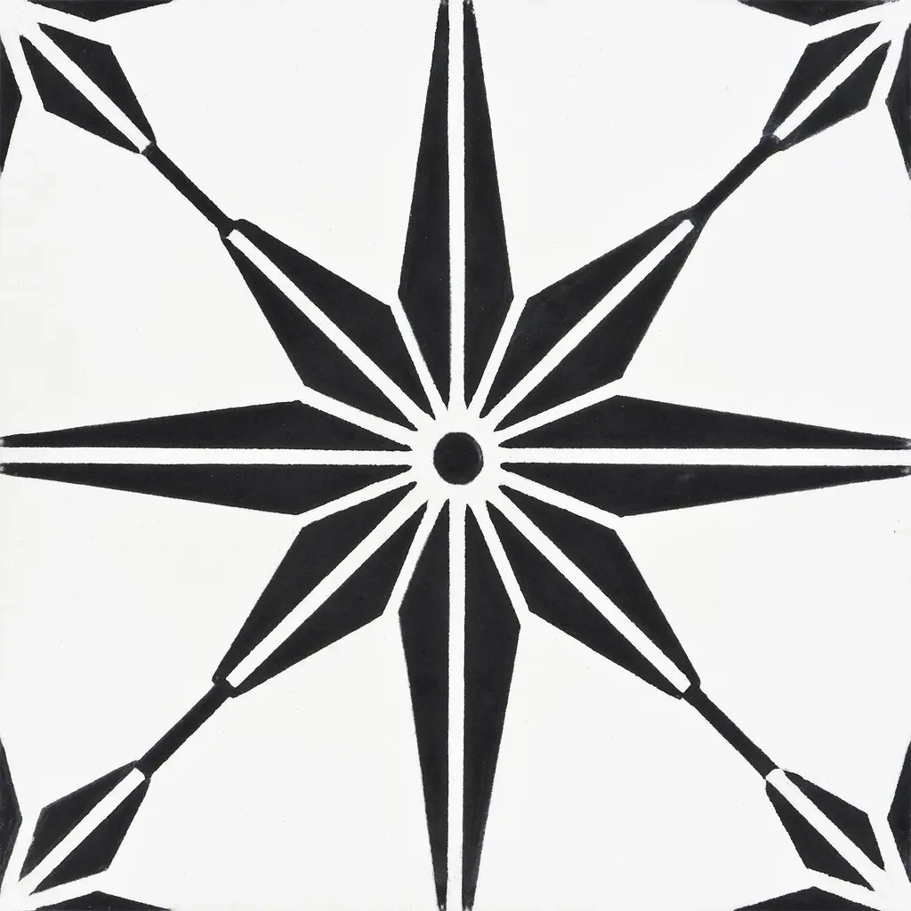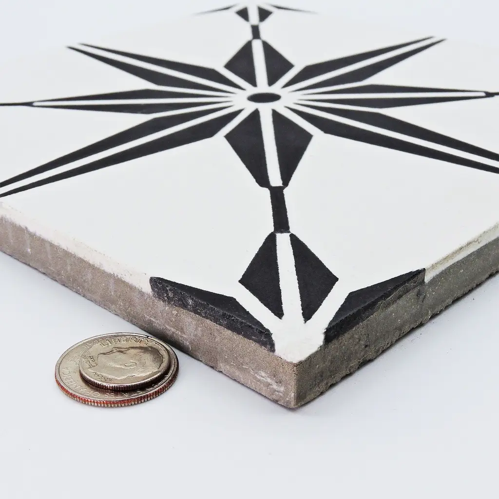 Breathe new life into your kitchen or bath with these Tafilalt tiles. Whether you use them for an arresting backsplash or to update your floors, you can count on the bold black and white design to easily integrate into a variety of color schemes. Moroccan artisans craft each tile by hand to ensure enduring quality. · Features:· Handmade in Morocco· Moroccan Mosaic and Tile House Brand· Decorative floor and wall tiles· Made of cement materials· Professional installation is recommended.· Tiles need to be sealed before and after grouting.· Eco-friendly· Indoor or outdoor use· Geometric pattern· When ordering a box, 12 tiles come included. Sample is just 1 tile.· 12 tiles per box, covering 5.22 square feet.· 2.3 tiles per square foot· Each tile measures 8 inches wide x 8 inches long· Story Behind the Art: "It's more than tile, it's art." That simple statement is what sets the craftsmanship of Moroccan Mosaic apart from the rest. Based in the small city of Sale, Moroccan Mosaic is a family business going back 4 generations. When Simo, the current head of the business graduated from university in New York, he had little interest in the family business. But on a return trip home, he saw that the business was not doing well and set about reviving it. One important change he made was introducing black, grey, and white designs to appeal to American and European customers. It worked. When he started, they employed 2 workers and now they have nearly 80 on staff. The workshop itself is fairly simple, and the techniques used to create the tiles are steeped in tradition. Some modern equipment is available, though the workers prefer to use the more rustic tools. The creative process is time intensive and done by hand, as Simo insists on no corners be cut or production be rushed. Environmentally responsible and resource efficient, no chemicals are used at any step. For example, colors used come from nature literally. Green comes from mint leaves, orange from orange peel, and black from charcoal. The tiles themselves are a simple mixture of cement, sand, and granite powder. Moroccan Mosaic hires only local workers, teaching them a valued skill as well as paying them fair wages. Simo's goals for his business are to share the tradition of gorgeous Moroccan tile, grow the business, and employ more and more workers.