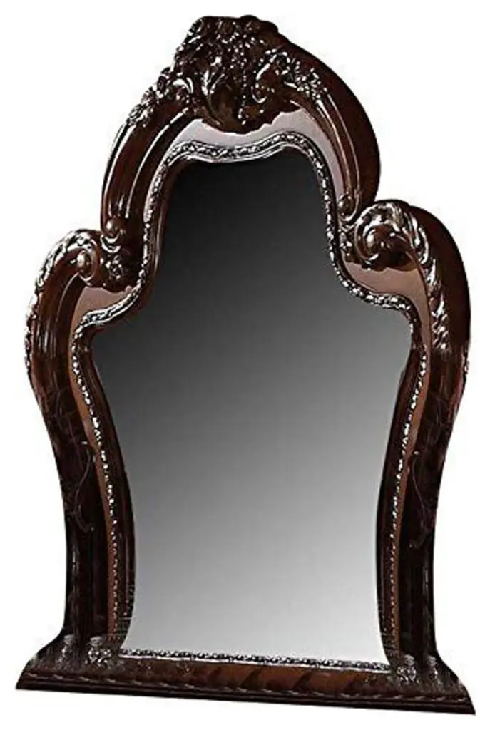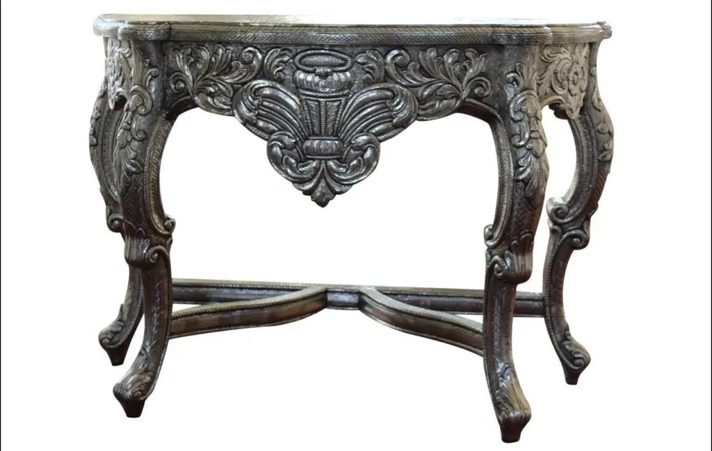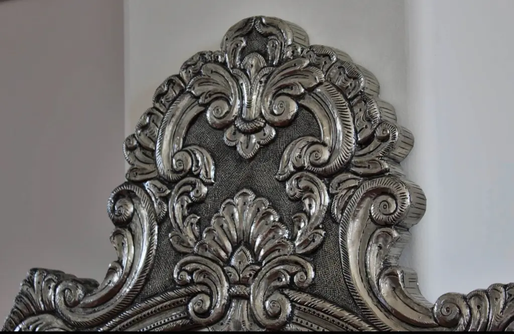 Ancient Persian style dresser used by queens. This masterpiece is handcrafted and has quirky blackened Silver metal embossed on high-quality wood. This art requires higher skill and its intricacy calls for the application of a technical mindset. Designs of flowers, birds, fish, etc. are engraved on it. Flower & leaf design. The mirror is wall mount ready. Dimensions: Table - 42"W X 18"D X 30"H Mirror - 48"H x 30 "W