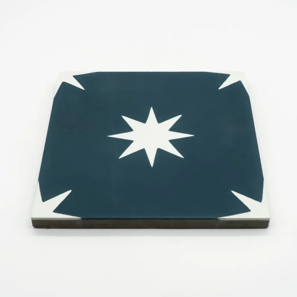 Transform your living space with this pack of twelve handmade cement tiles from Morocco. The unique geometric design in navy blue and white colors will add a touch of elegance to your floors or walls. Each tile measures eight inches square, and the pack covers 5.22 square feet of surface area. Made with eco-friendly materials and suitable for indoor or outdoor use, these decorative tiles are perfect for any style of home decor.Features:· Story Behind the Art: "It's more than tile, it's art." That simple statement is what sets the craftsmanship of Moroccan Mosaic apart from the rest. Based in the small city of Sale, Moroccan Mosaic is a family business going back 4 generations. When Simo, the current head of the business graduated from university in New York, he had little interest in the family business. But on a return trip home, he saw that the business was not doing well and set about reviving it. One important change he made was introducing black, grey, and white designs to appeal to American and European customers. It worked. When he started, they employed 2 workers and now they have nearly 80 on staff. The workshop itself is fairly simple, and the techniques used to create the tiles are steeped in tradition. Some modern equipment is available, though the workers prefer to use the more rustic tools. The creative process is time intensive and done by hand, as Simo insists on no corners be cut or production be rushed. Environmentally responsible and resource efficient, no chemicals are used at any step. For example, colors used come from nature literally. Green comes from mint leaves, orange from orange peel, and black from charcoal. The tiles themselves are a simple mixture of cement, sand, and granite powder. Moroccan Mosaic hires only local workers, teaching them a valued skill as well as paying them fair wages. Simo's goals for his business are to share the tradition of gorgeous Moroccan tile, grow the business, and employ more and more workers.