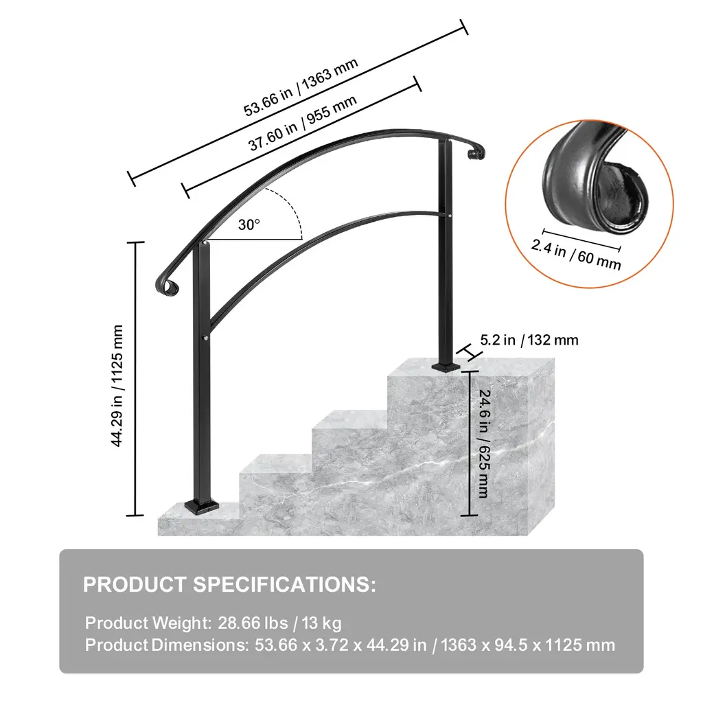 Flexible for 4/3 Steps: Max Height for Steps: 18.7"/47.5 cm; Distance Between Posts: 37.6"/25"; Upper Post Height: 38.2"/97 cm; Lower Post Height: 41.7"/106 cm. Due to the flexible height, our wrought iron handrail fits your 4 steps according to the different sizes. It is perfect for helping people keep balance in the rain or winter and prevent skidding. Sturdy Wrought Iron: This outdoor stair railing is made from durable wrought iron material with thick solid bases, which is more rigid and reliable than aluminum products. The stable and sturdy construction ensures an excellent load capacity to provide a secure grab bar for your family. Moreover, the ergonomic design is adopted to create a comfortable grip. Effortless Installation: The front porch hand rail is easy to assemble with complete accessories, including 4 x M8 bolts, 8 x wood screws, 8 x expansion screws, 2 x Allen wrenches, and 1 x open-ended spanner. Just choose your desired location, mark it, drill holes on the mounting surface, set up screws, and finally place base trim over fasteners. It only takes a few minutes to finish the installation. Stylish & Delicate Design: Our handrail for concrete steps features a smooth powder-coated surface with chic black, which allows you to clean it with water or cloth easily and quickly. Its classic curly side design is beautiful and delicate, making it more ornamental and eye-catching. In addition to providing security protection, the handrail also decorates your stairs. Extensive Application: The railing for steps provides extra security for the elderly, children, pregnant, disabled family members, and people after surgery. It can be installed on concrete, brick, and wood steps of porches, balconies, gardens, residential buildings, hotels, garages, etc. This outdoor railing is ideal for places where you cannot attach to a wall or structure. Package Content 1 x Handrail 4 x M8 Bolts 8 x Wood Screws 8 x Expansion Screws 1 x Open-Ended Spanner 2 x Allen Wrenches