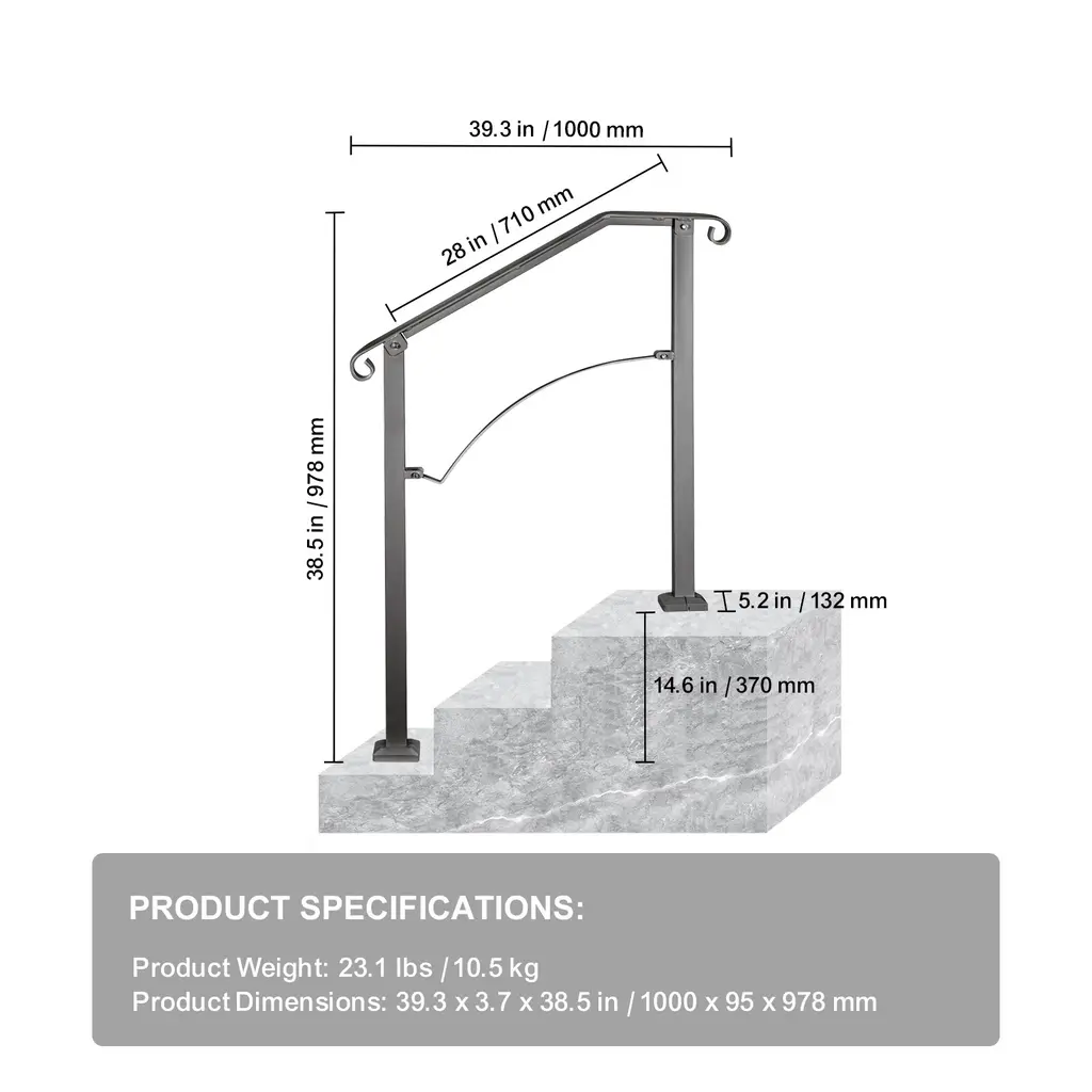 Flexible for 1/1-3/3/2 /4 or 5 / 3 or 4 / 2 or 3/ 1 or 2 Step: Max Height for Steps: 6.3 in/17.7 in(for 1-3 steps option )/ 25.5"(for 3 step option)/23.6 in(for 2 step option)/32"(for 4-5 step option)/26"(for 3-4 step option )/14.6"(for 2or 3 step option)/6.8"(for 1or2 step option); Distance Between Posts: 13.4 in/27in/42.7"/34.8 in/38.2"/43.8"; Post Height: 37.8"/38.35"/38.35"/38.5". Due to the flexible height, our wrought iron handrail fits your 1 step according to the different sizes. It is perfect for helping people keep balance in the rain or winter and prevent skidding. Sturdy Wrought Iron: This outdoor stair railing is made from durable wrought iron material with thick solid bases, which is more rigid and reliable than aluminum products. The stable and sturdy construction ensures an excellent load capacity to provide a secure grab bar for your family. Moreover, the ergonomic design is adopted to create a comfortable grip. Effortless Installation: The front porch hand rail is easy to assemble with complete accessories, including 2 x M6 bolts, 8 x self-tapping screws, 8 x expansion screws, and 2 x open-ended spanners. Just choose your desired location, mark it, drill holes on the mounting surface, set up screws, and finally place base trim over fasteners. It only takes a few minutes to finish the installation. Stylish & Delicate Design: Our handrail for concrete steps features a smooth powder-coated surface with chic black, which allows you to clean it with water or cloth easily and quickly. Its classic curly side design is beautiful and delicate, making it more ornamental and eye-catching. In addition to providing security protection, the handrail also decorates your stairs. Extensive Application: The railing for steps provides extra security for the elderly, children, pregnant, disabled family members, and people after surgery. It can be installed on concrete, brick, and wood steps of porches, balconies, gardens, residential buildings, hotels, garages, etc. This outdoor railing is ideal for places where you cannot attach to a wall or structure. Package Content 1 x Handrail 2 x M6*20 Bolts 8 x Self-Tapping Screws 8 x Expansion Screws 2 x Open-Ended Spanners