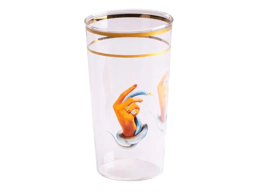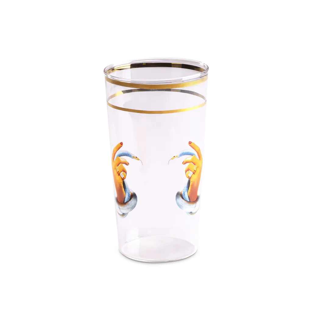 Set of six glasses made of glass with a golden edge. A slightly retro touch for a modern and edgy collection, in classic TOILETPAPER style. They’re perfect for aperitif sipped under a colorful neon light.Material: Borosilicate Glass, Gold