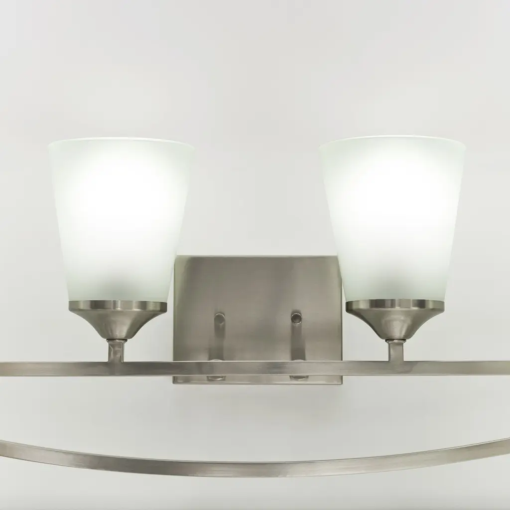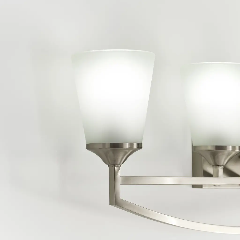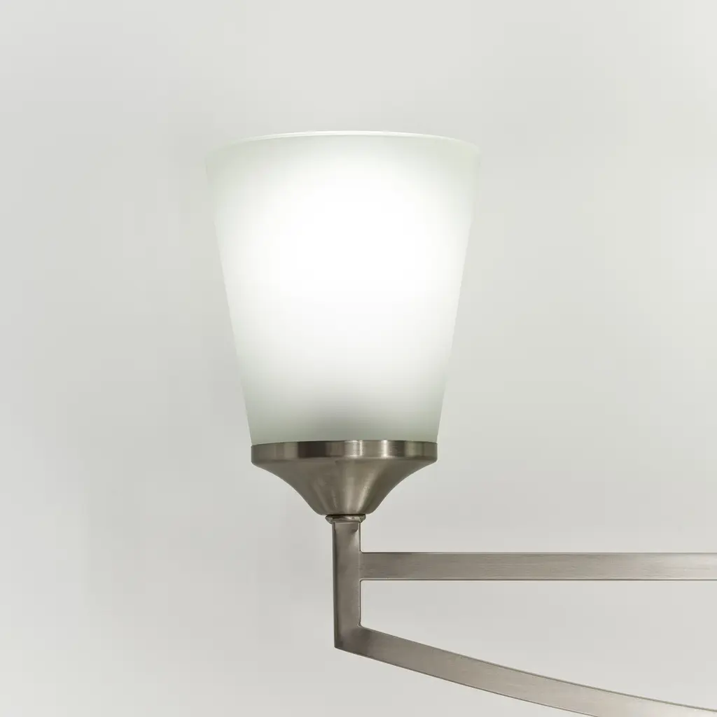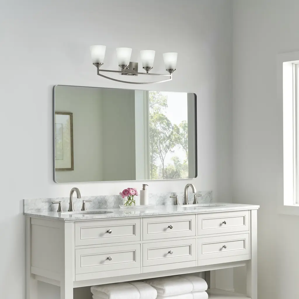 The Hanford four light vanity fixture in brushed nickel offers shadow-free lighting in your powder room, spa, or master bath room. The transitional styling of the Hanford lighting collection by is evident in its elegant symmetry articulated by long, sweeping arms. Tapered Etched glass shades produce a soft uplight and make Hanford complementary to a wide array of decor from traditional to contemporary. Offered in both Brushed Nickel and Burnt Sienna finishes, the collection includes five-, nine- and fifteen-light chandeliers, a three-light hall/foyer light, a one-light mini pendant, a three-light pendant, a three-light semi-flush mount which can convert into a pendant, and one-, two-, three- and four-light bath fixtures. Incandescent and ENERGY STAR-qualified LED lamping are available; all fixtures are California Title 24 compliant.