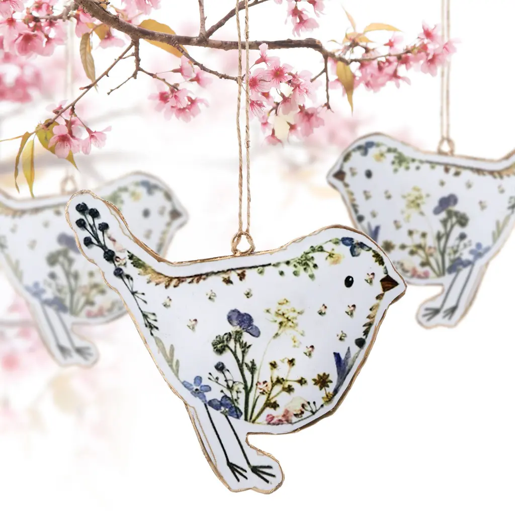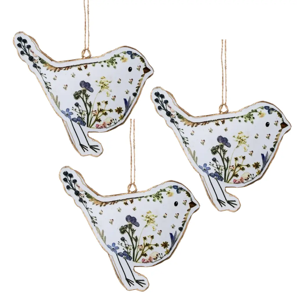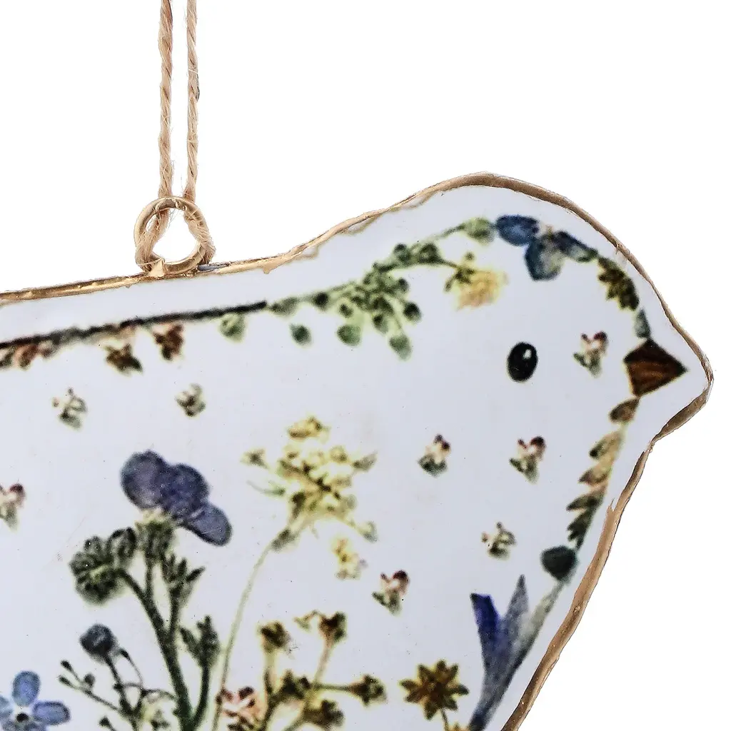 Add a charming 6"X5" T Hanging Metal Floral Bird in a set of 3 to your home this spring. Beautiful floral details take the shape of a bird and are printed on a metal silhouette, bringing a touch of whimsy to any home or garden. The design is featured on both sides of the bird with a gold outline completing the look. Easily hang from plants, patio, or on a wall with the attached twine rope. Intended for decorative use.