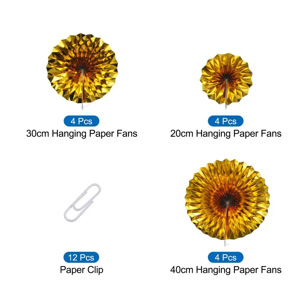What is this?Hanging paper fans set are decor for home,party,birthday,wedding,graduation events, shop window dressing, halloween, christmas,etc.They can be attached to walls, hung on trees, trees, ceilings, curtains or doors, and above tables.What will I get?Paper fans decoration set ,Size:15.74inchx4pcs+11.81inchx4pcs+7.87inchx4pcs ;Color:Gold;Material:Paper;In the package of: 12 x Hanging Paper Fans,12 x paper clip;Is there any advantages of the product?1. Great design: Paper fans decoration set contains multiple paper folding fans, each with a unique and beautiful design. Whether it's flowers, patterns or textures, you can add a visual effect to your scene. 2. This set of paper fans decorations is made of paper materials, strong, to ensure long-term durability. 3. Add a festive feel: Whether celebrating a birthday, wedding, party or holiday event, this set of decorations can create a joyous and festive atmosphere for the scene. How to use it?Paper fans decoration set is simple and easy to install by simply opening the folding fan and securing it in the desired position using accessories such as pastes or clips provided(Or use paper clip).What should I notice?Notes:Be careful when opening or folding paper folding fans to avoid excessive force.
