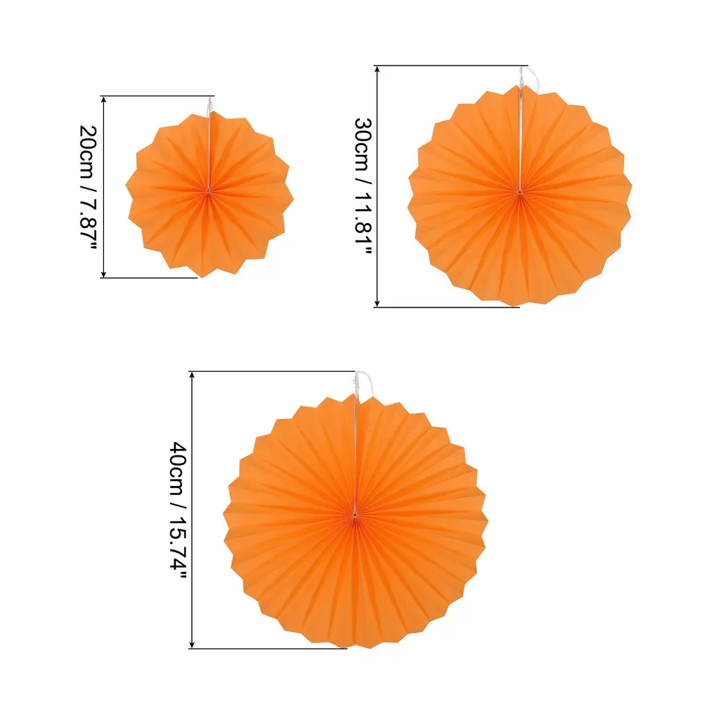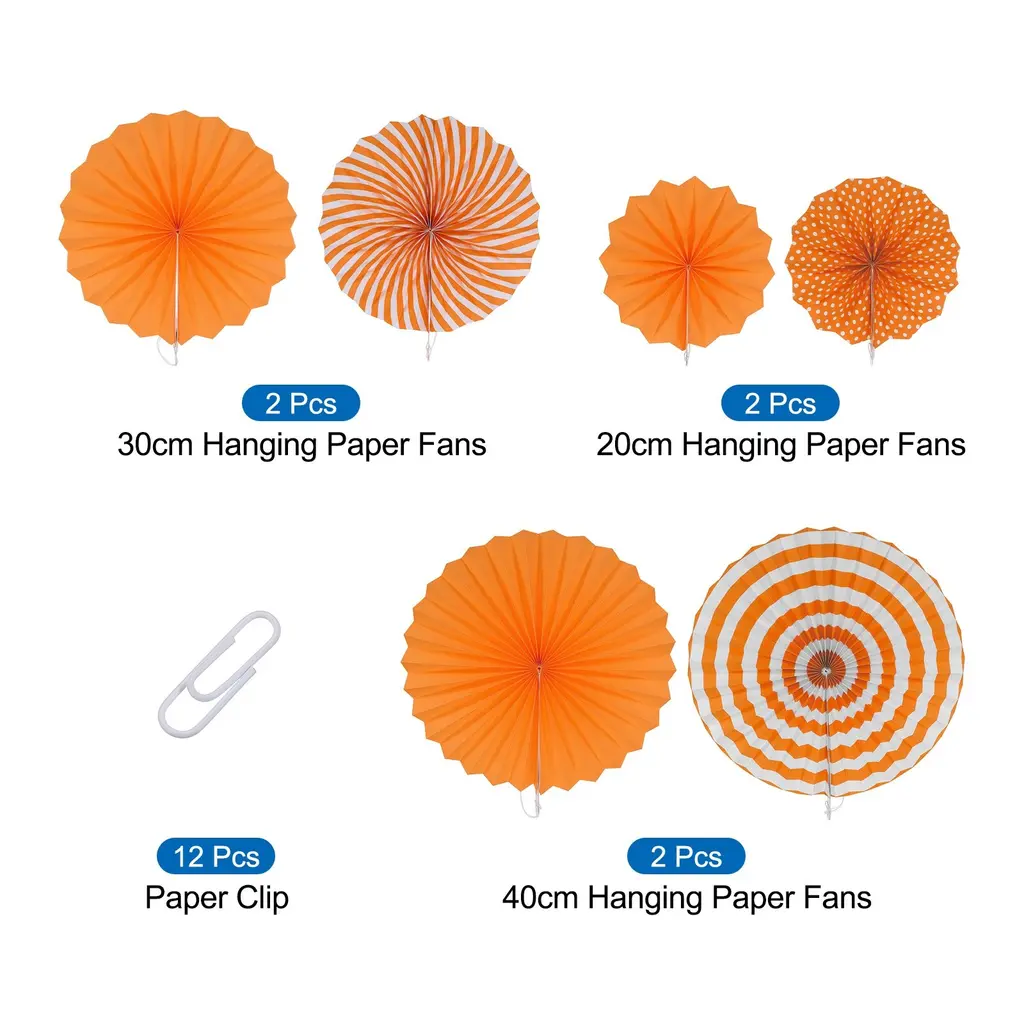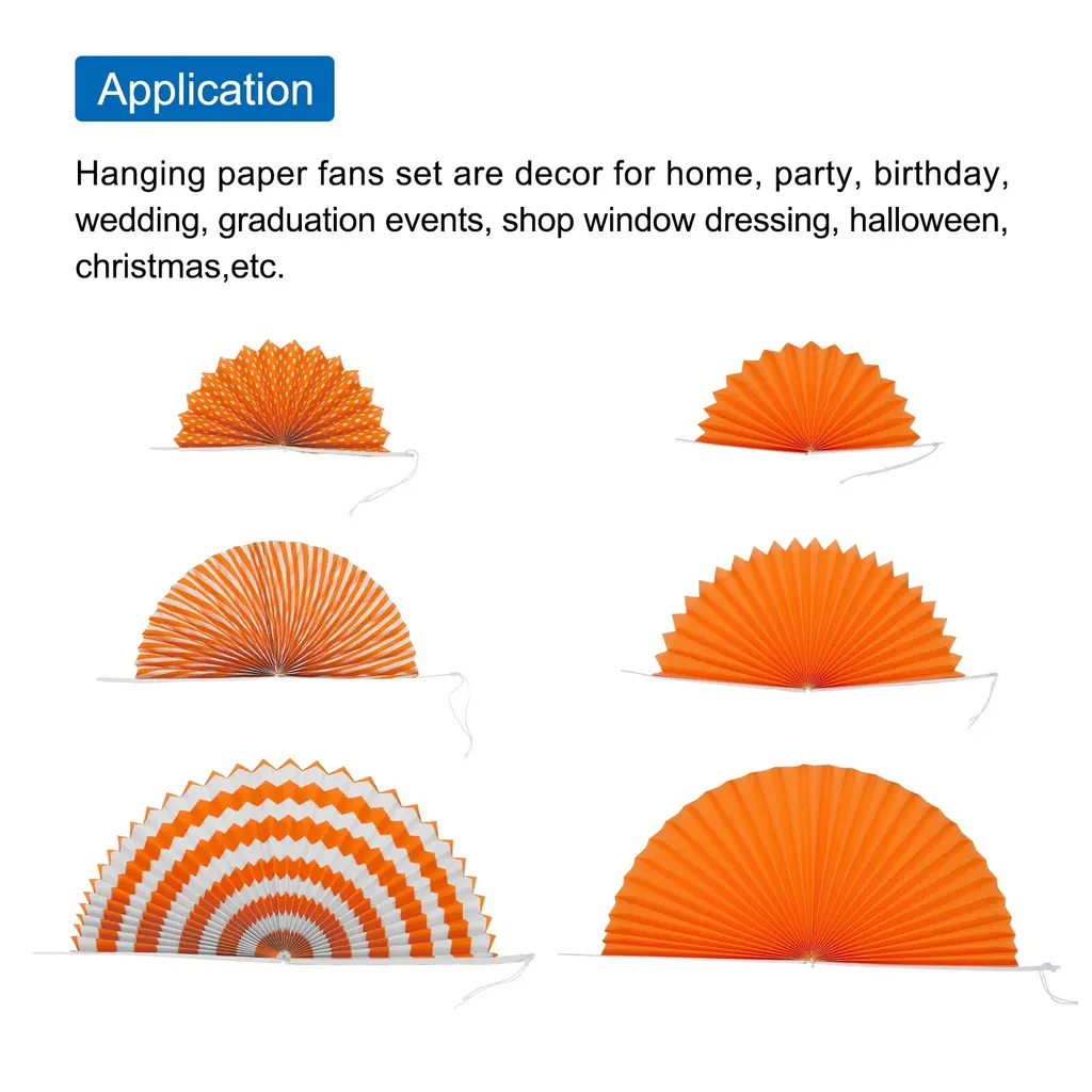 What is this?Hanging paper fans set are decor for home,party,birthday,wedding,graduation events, shop window dressing, halloween, christmas,etc.They can be attached to walls, hung on trees, trees, ceilings, curtains or doors, and above tables.What will I get?Paper fans decoration set ,Size:15.74inchx4pcs+11.81inchx4pcs+7.87inchx4pcs ;Color:Orange;Material:Paper;In the package of: 12 x Hanging Paper Fans,12 x paper clip;Is there any advantages of the product?1. Great design: Paper fans decoration set contains multiple paper folding fans, each with a unique and beautiful design. Whether it's flowers, patterns or textures, you can add a visual effect to your scene. 2. This set of paper fans decorations is made of paper materials, strong, to ensure long-term durability. 3. Add a festive feel: Whether celebrating a birthday, wedding, party or holiday event, this set of decorations can create a joyous and festive atmosphere for the scene. How to use it?Paper fans decoration set is simple and easy to install by simply opening the folding fan and securing it in the desired position using accessories such as pastes or clips provided(Or use paper clip).What should I notice?Notes:Be careful when opening or folding paper folding fans to avoid excessive force.