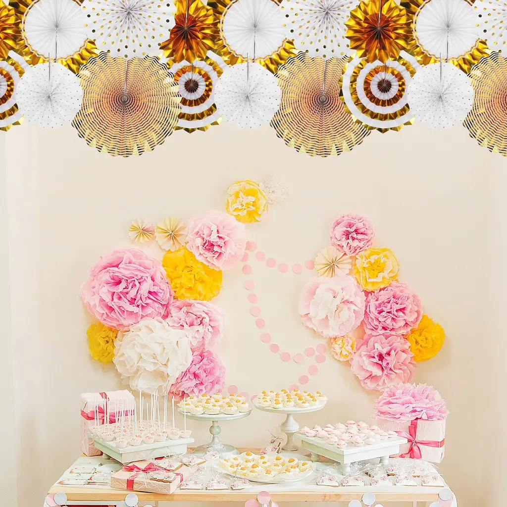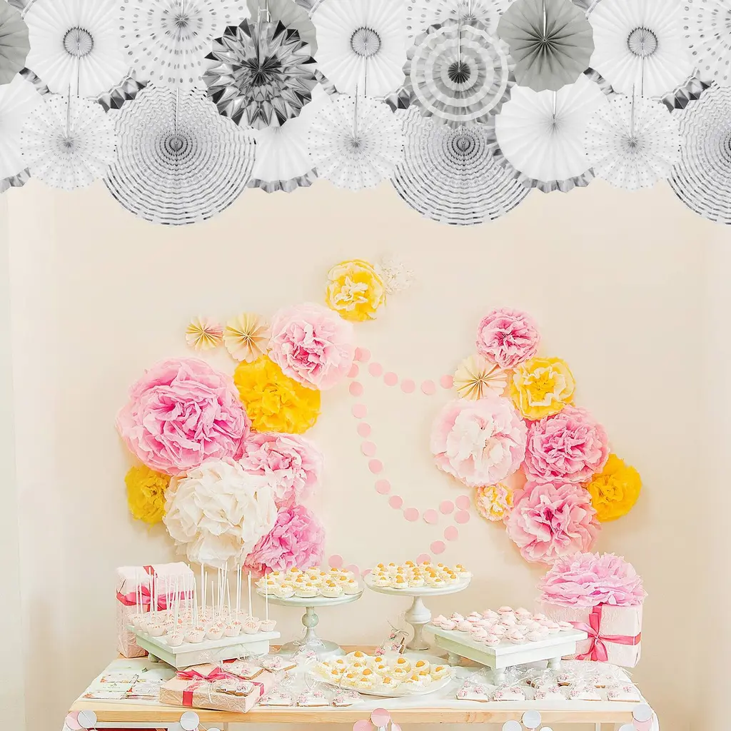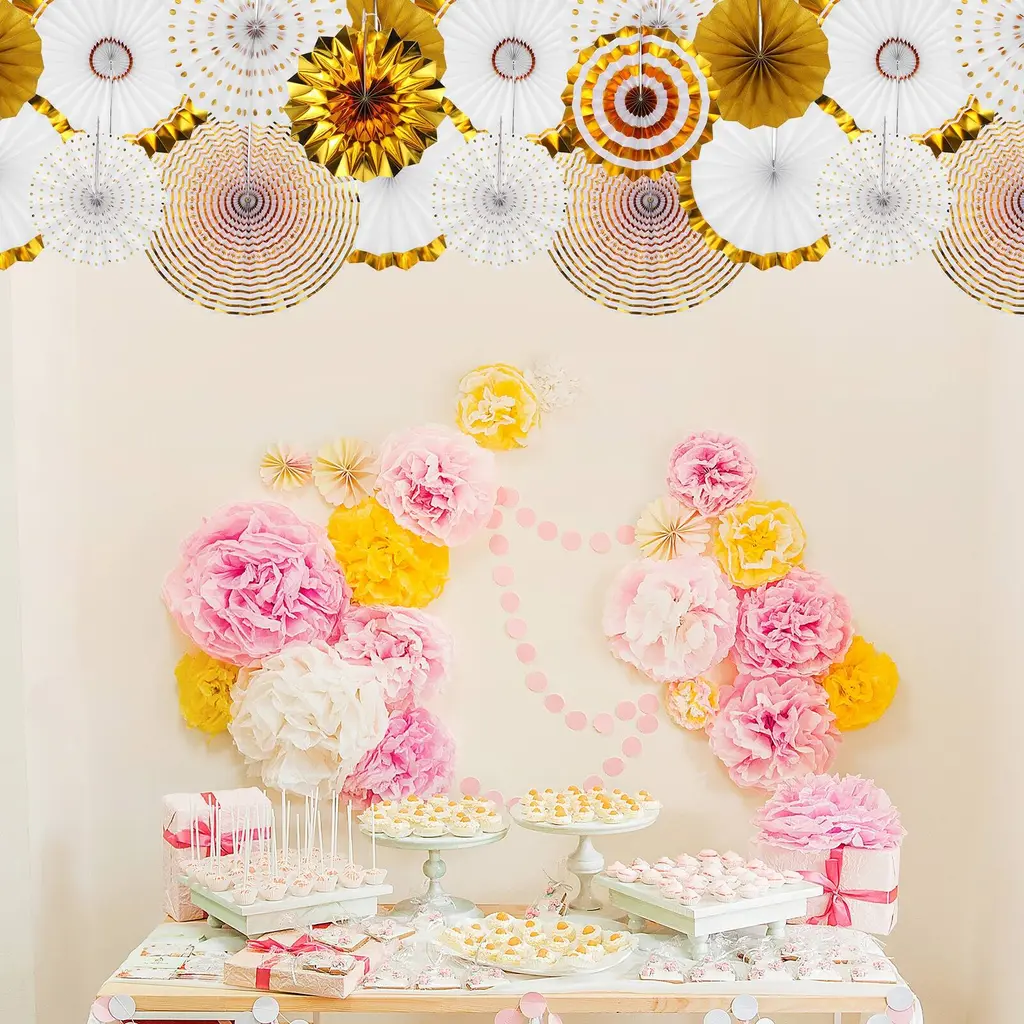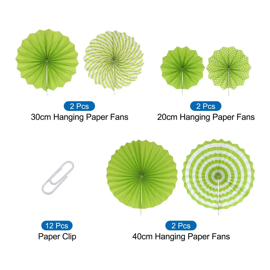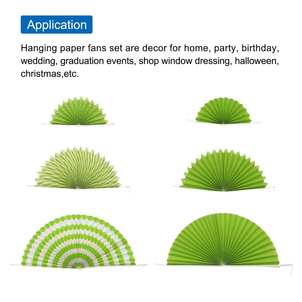 What is this?Hanging paper fans set are decor for home,party,birthday,wedding,graduation events, shop window dressing, halloween, christmas,etc.They can be attached to walls, hung on trees, trees, ceilings, curtains or doors, and above tables.What will I get?Paper fans decoration set ,Size:15.74inchx4pcs+11.81inchx4pcs+7.87inchx4pcs ;Color:Green;Material:Paper;In the package of: 12 x Hanging Paper Fans,12 x paper clip;Is there any advantages of the product?1. Great design: Paper fans decoration set contains multiple paper folding fans, each with a unique and beautiful design. Whether it's flowers, patterns or textures, you can add a visual effect to your scene. 2. This set of paper fans decorations is made of paper materials, strong, to ensure long-term durability. 3. Add a festive feel: Whether celebrating a birthday, wedding, party or holiday event, this set of decorations can create a joyous and festive atmosphere for the scene. How to use it?Paper fans decoration set is simple and easy to install by simply opening the folding fan and securing it in the desired position using accessories such as pastes or clips provided(Or use paper clip).What should I notice?Notes:Be careful when opening or folding paper folding fans to avoid excessive force.