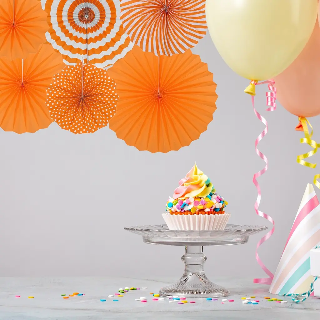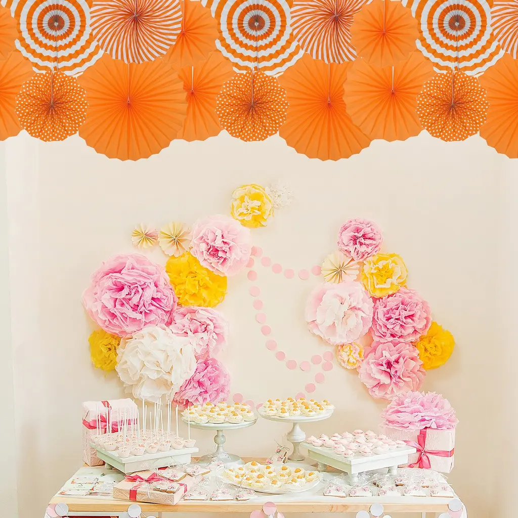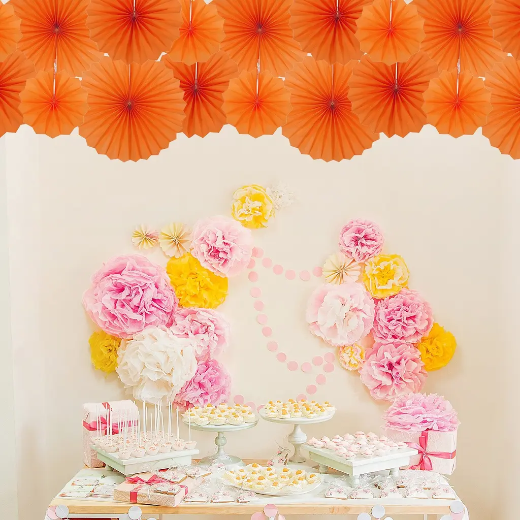 What is this?Hanging paper fans set are decor for home,party,birthday,wedding,graduation events, shop window dressing, halloween, christmas,etc.They can be attached to walls, hung on trees, trees, ceilings, curtains or doors, and above tables.What will I get?Paper fans decoration set ,Size:15.74inchx2pcs+11.81inchx2pcs+7.87inchx2pcs ;Color:Orange;Material:Paper;In the package of: 6 x Hanging Paper Fans,6 x paper clip;Is there any advantages of the product?1. Great design: Paper fans decoration set contains multiple paper folding fans, each with a unique and beautiful design. Whether it's flowers, patterns or textures, you can add a visual effect to your scene. 2. This set of paper fans decorations is made of paper materials, strong, to ensure long-term durability. 3. Add a festive feel: Whether celebrating a birthday, wedding, party or holiday event, this set of decorations can create a joyous and festive atmosphere for the scene. How to use it?Paper fans decoration set is simple and easy to install by simply opening the folding fan and securing it in the desired position using accessories such as pastes or clips provided(Or use paper clip).What should I notice?Notes:Be careful when opening or folding paper folding fans to avoid excessive force.