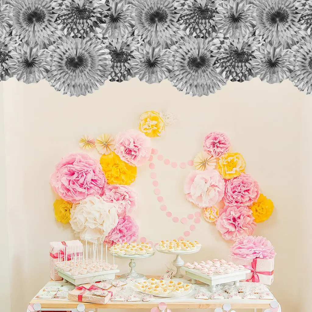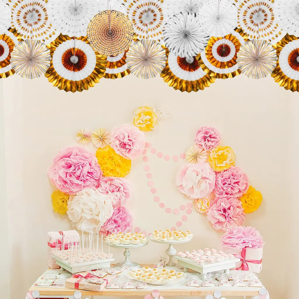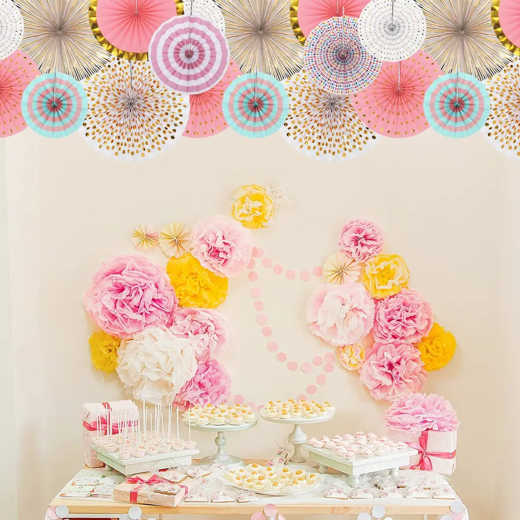 What is this?Hanging paper fans set are decor for home,party,birthday,wedding,graduation events, shop window dressing, halloween, christmas,etc.They can be attached to walls, hung on trees, trees, ceilings, curtains or doors, and above tables.What will I get?Paper fans decoration set ,Size:15.74inchx2pcs+11.81inchx2pcs+7.87inchx2pcs ;Color:Orange;Material:Paper;In the package of: 6 x Hanging Paper Fans,6 x paper clip;Is there any advantages of the product?1. Great design: Paper fans decoration set contains multiple paper folding fans, each with a unique and beautiful design. Whether it's flowers, patterns or textures, you can add a visual effect to your scene. 2. This set of paper fans decorations is made of paper materials, strong, to ensure long-term durability. 3. Add a festive feel: Whether celebrating a birthday, wedding, party or holiday event, this set of decorations can create a joyous and festive atmosphere for the scene. How to use it?Paper fans decoration set is simple and easy to install by simply opening the folding fan and securing it in the desired position using accessories such as pastes or clips provided(Or use paper clip).What should I notice?Notes:Be careful when opening or folding paper folding fans to avoid excessive force.