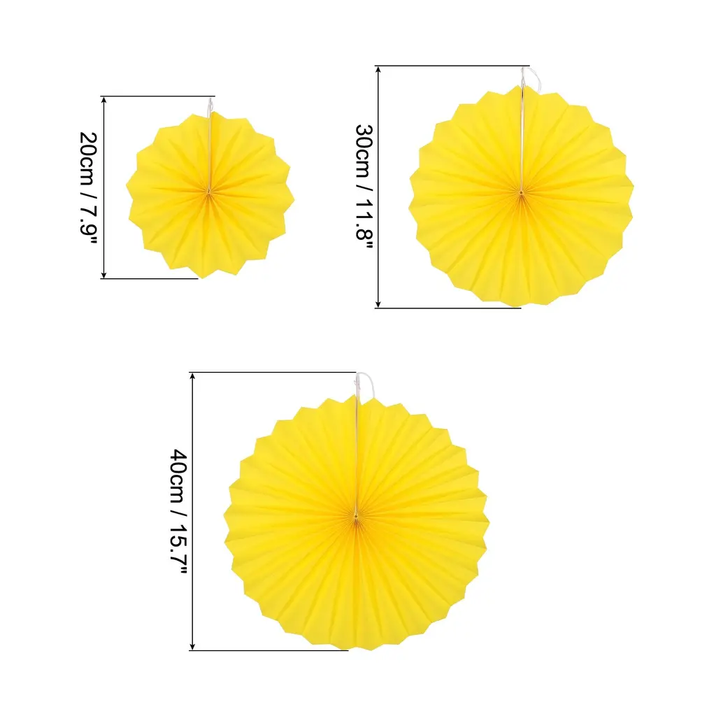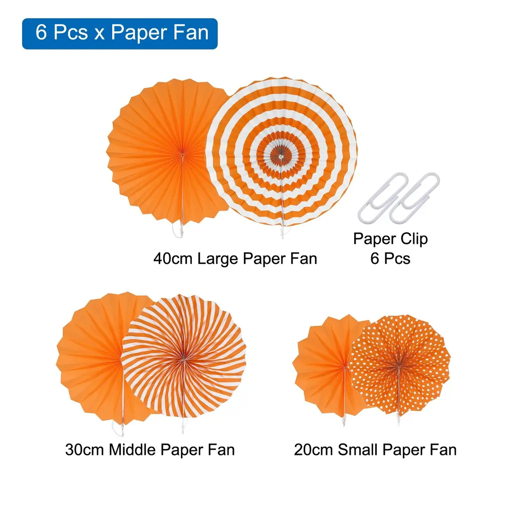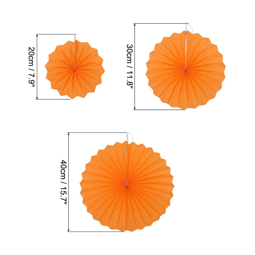 Description:1. The hanging paper fan set is made of good quality thickened paper material, ensuring durability and sturdiness for long-lasting use.2. Each paper fan features a round pattern design, adding a festive and elegant touch to any party or event decoration. Each paper fan has a rope that is easy to assemble and easy to store.3. To assemble the paper fans, unfold and secure them with the attached strings, or use clips to hang them on walls, ceilings, or trees to enhance the decor of your event instantly.4. These paper fan decorations are great for both indoor and outdoor use, making them versatile decorations for a wide range of events and venues, they can be used as decorations for parties, birthdays, graduations, Christmas, holidays, weddings, and other special occasions, creating a beautiful atmosphere.5. To prevent damage when used outdoors, make sure these paper fans are protected from the wind. Also, store them in a cool, dry place when not in use to maintain their quality and appearance.Specification:Material: PaperColor: OrangeLarge Paper Fan Diameter: 20cm/7.9"Middle Paper Fan Diameter: 30cm/11.8"Small Paper Fan Diameter: 40cm/15.7"Package Included: 6pcs x paper fan