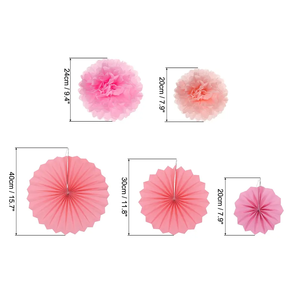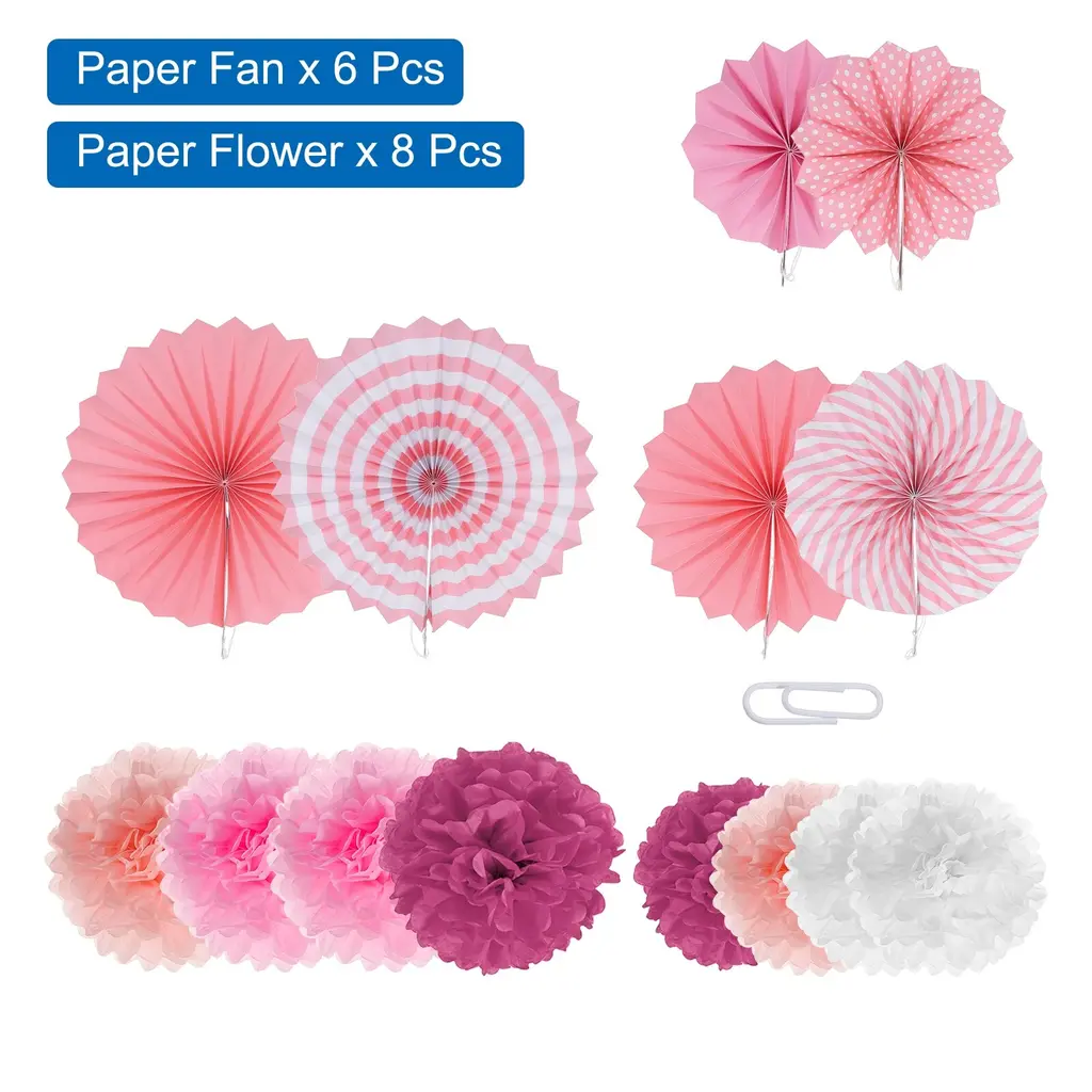 Description:1. The hanging paper fan set is made of good quality thickened paper material, ensuring durability and sturdiness for long-lasting use.2. Each paper fan and paper flower features a round pattern design, adding a festive and elegant touch to any party or event decoration. Each paper fan has a rope that is easy to assemble and easy to store.3. To assemble the paper fans and paper flowers, unfold and secure them with the attached strings, or use clips to hang them on walls, ceilings, or trees to enhance the decor of your event instantly.4. These paper fan decorations are great for both indoor and outdoor use, making them versatile decorations for a wide range of events and venues, they can be used as decorations for parties, birthdays, graduations, Christmas, holidays, weddings, and other special occasions, creating a beautiful atmosphere.5. To prevent damage when used outdoors, make sure these paper fans are protected from the wind. Also, store them in a cool, dry place when not in use to maintain their quality and appearance.Specification:Material: PaperColor: PinkPaper Fan Diameter: 24/34/45cm (9.4"/13.4"/17.7")White Paper Flower Diameter: 20cm(7.9")Pink Paper Flower Diameter: 24/20cm(9.4"/7.9")Rose Pink Paper Flower Diameter: 24/20cm(9.4"/7.9")Package Included: 6pcs x paper fan, 8pcs x paper flower