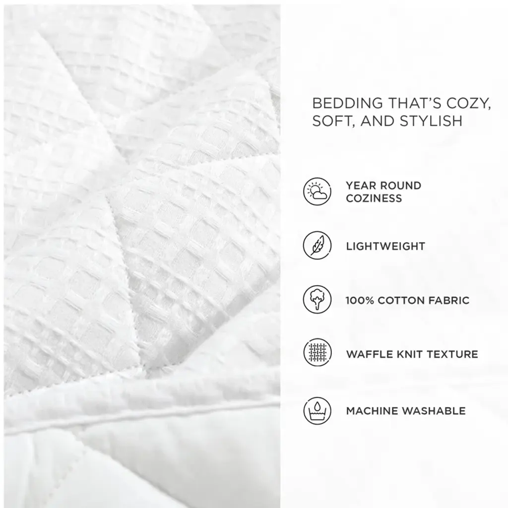 Decorate your bedroom with the Haniya Solid Waffle Woven Textured Cotton Quilt Set, perfect for all ages. The neutral solid color and cozy feel of the soft waffle knit texture makes this bedding a must-have in every home. This cotton waffle weave quilt set is ideal for a primary or guest bedroom in just about any home decor theme. Whether you love modern, traditional, minimalist or farmhouse style decor, this bedding set can fit right in with any of those. This 100% cotton quilt offers softness and breathability. The polyfill is perfect for hot sleepers and great as an extra layer for those cold sleepers who layer-up to keep warm. This bedding set is fabric, dyes and all components have been tested in an independent laboratory and certified against a list of more than 350 harmful substances. Caring for this Haniya Waffle Quilt Set is easy, simply machine wash cold on the gentle cycle and tumble dry on low. Please refer to label for full care instructions.